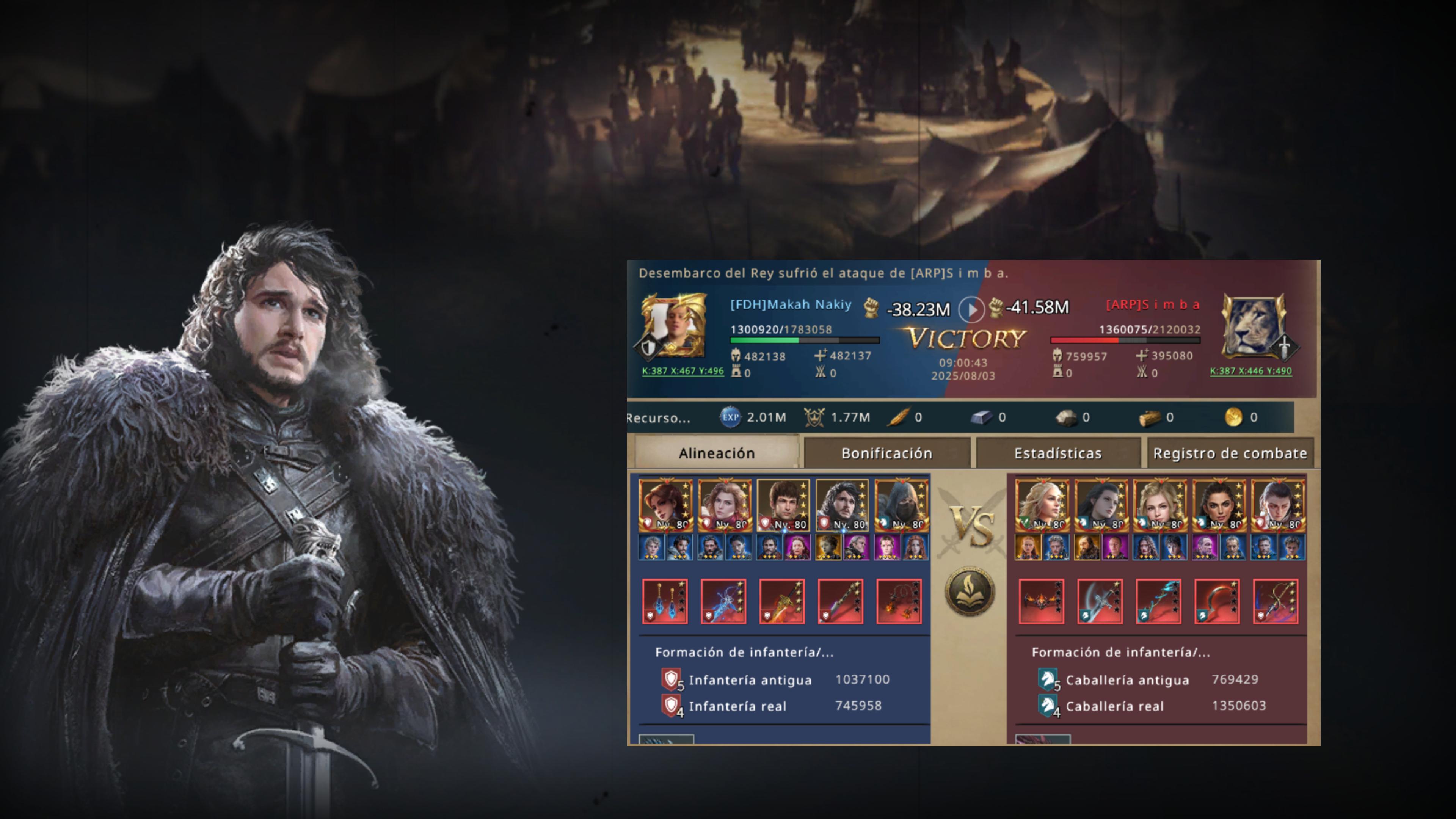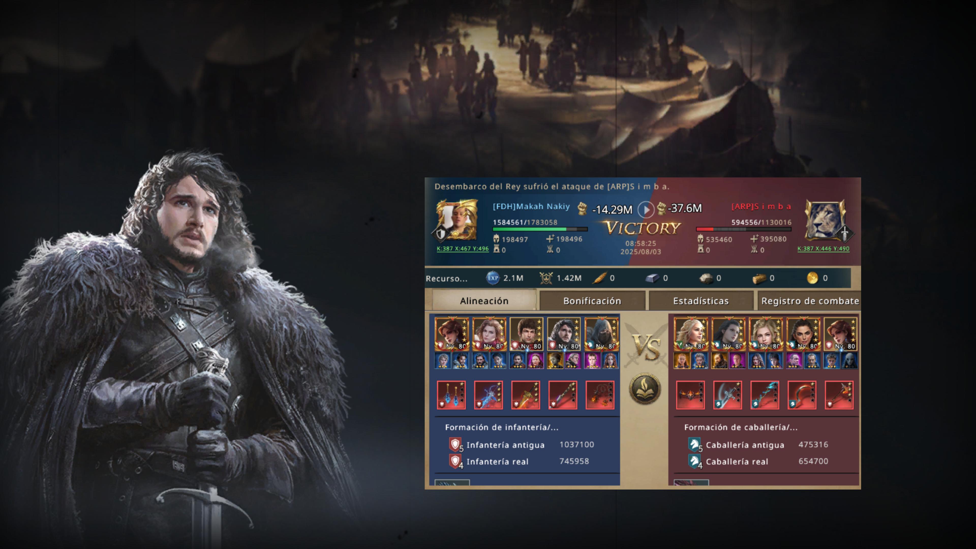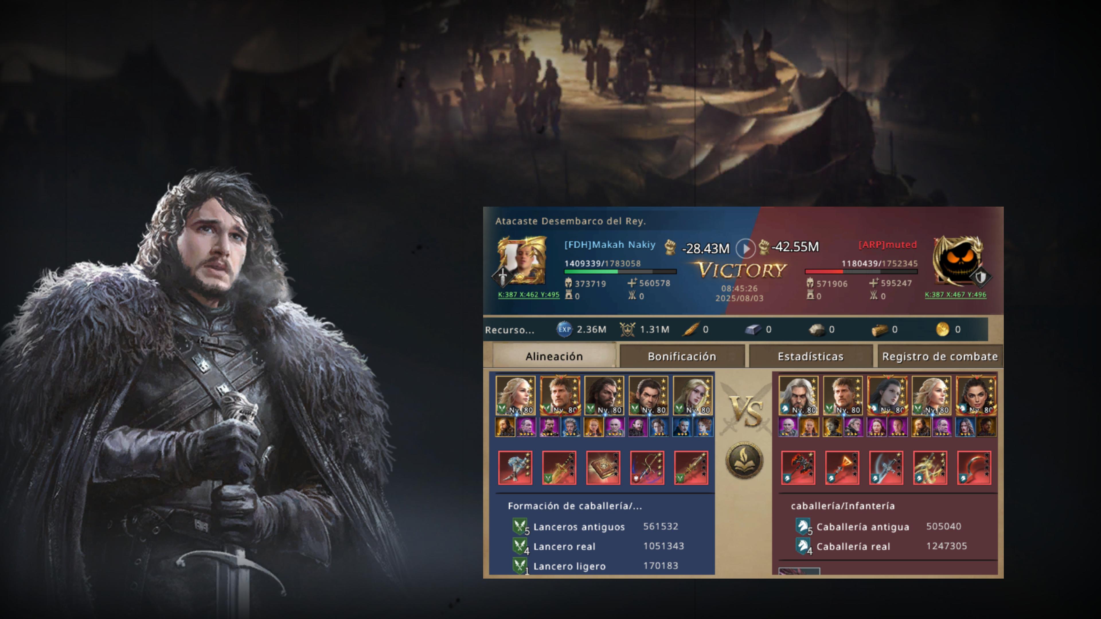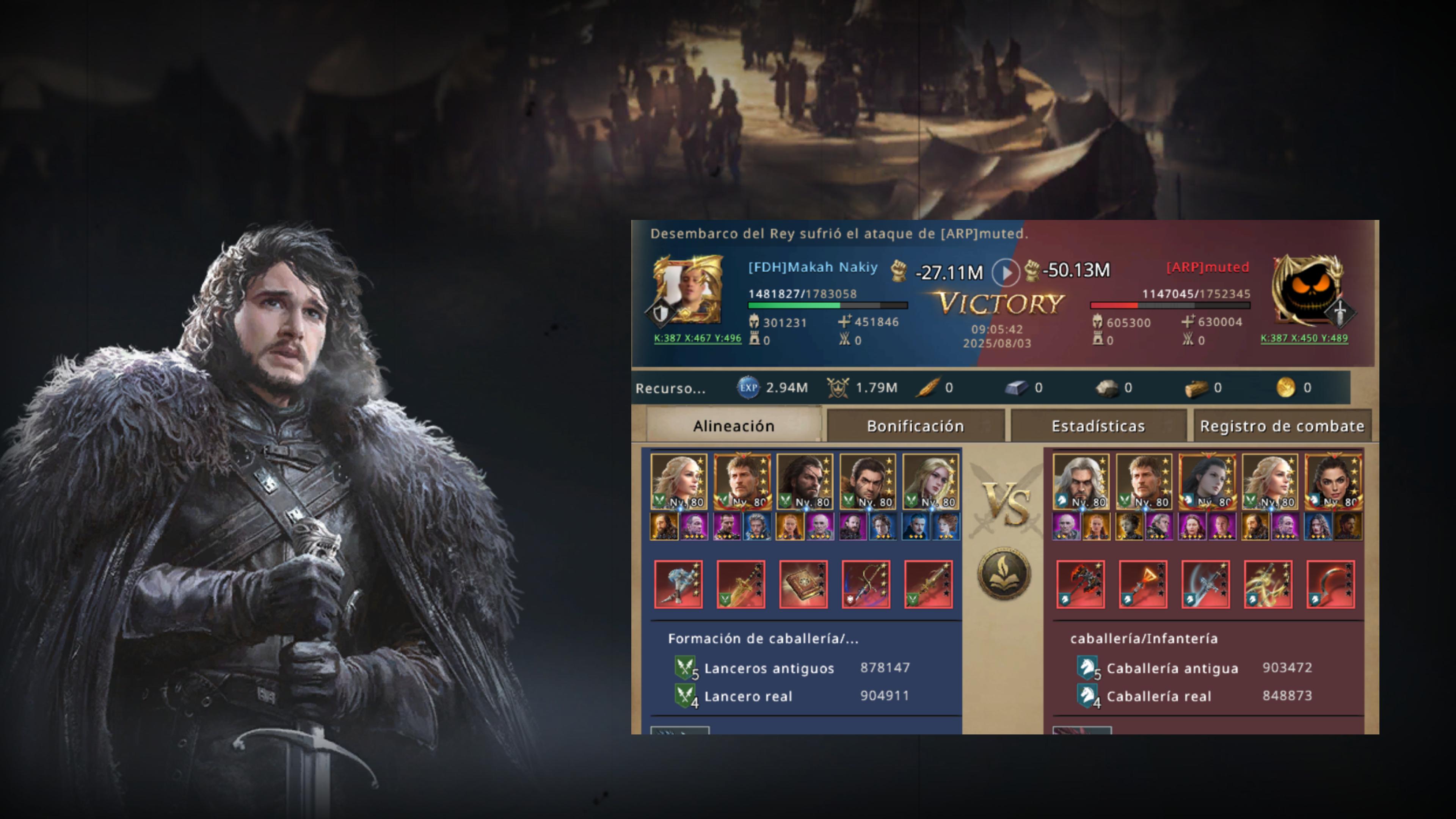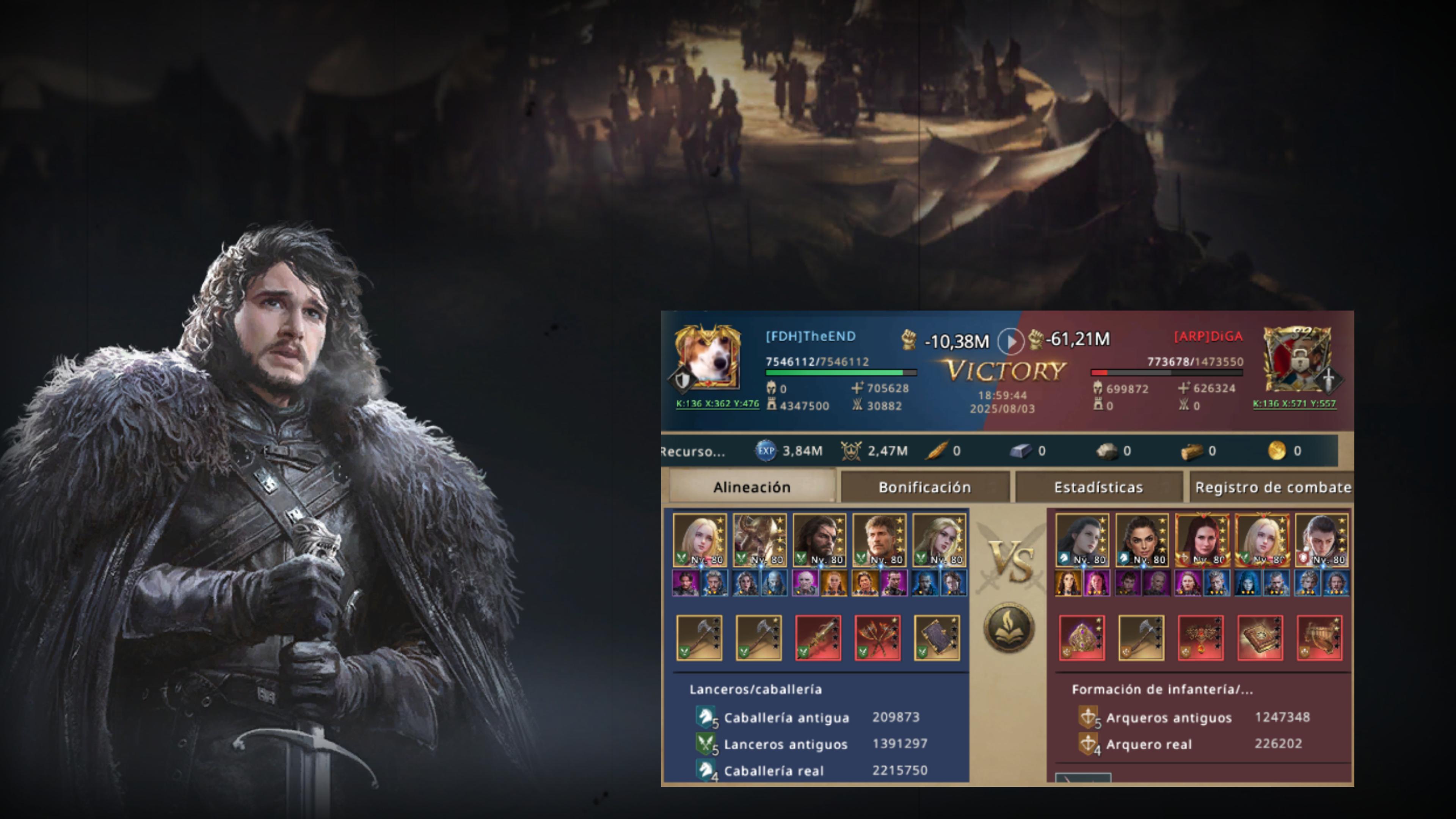 The next day the promise was fulfilled Simba had a group of cavalry players, to which he immediately observes me fervently and without a bubble decides to block me again, but this time he would not be the initiator of the rally, but his alliance partner, muted, who has better cavalry than him. My expectations of winning were very low, since he was my counter and I only had TheEND to help me, but the result is victory for me, with muted losing his lord, that means they still do not have my information or my stats, then Simba looking for justice tells me to hit Dequell, a trap castle of his, to which I respond that it would not be fair to fight like this since I would sacrifice high troops for low troops, besides they are winning and any carelessness would consolidate as a defeat for me, so I proposed to him and muted to fight 1 on 1 in King's Landing ... since they were more.