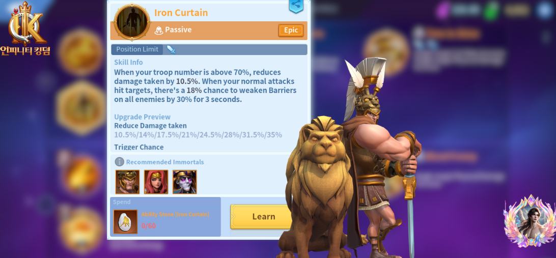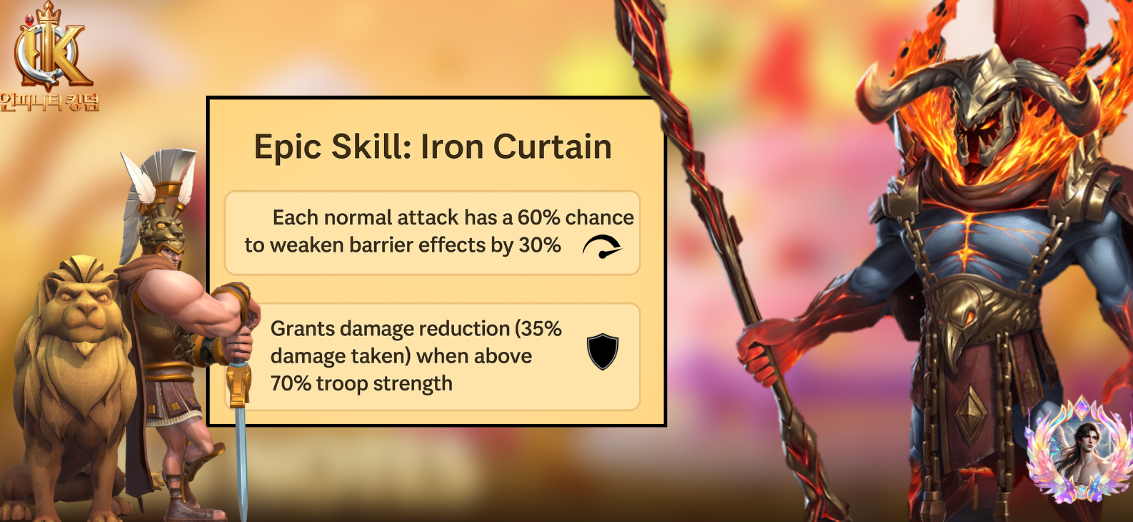 - Grants damage reduction (35% damage reduced) when above 70% troop strength