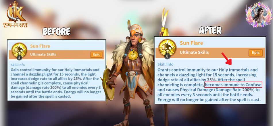 Sun Flare received a small but notable adjustment in this patch. The skill still grants control immunity to all Holy Immortals and channels a dazzling light for 15 seconds, increasing dodge rate for all allies by 25%. After the channeling phase, Manco becomes immune to Confuse and continues to deal 200% physical damage to all enemies every 3 seconds until the end of battle.