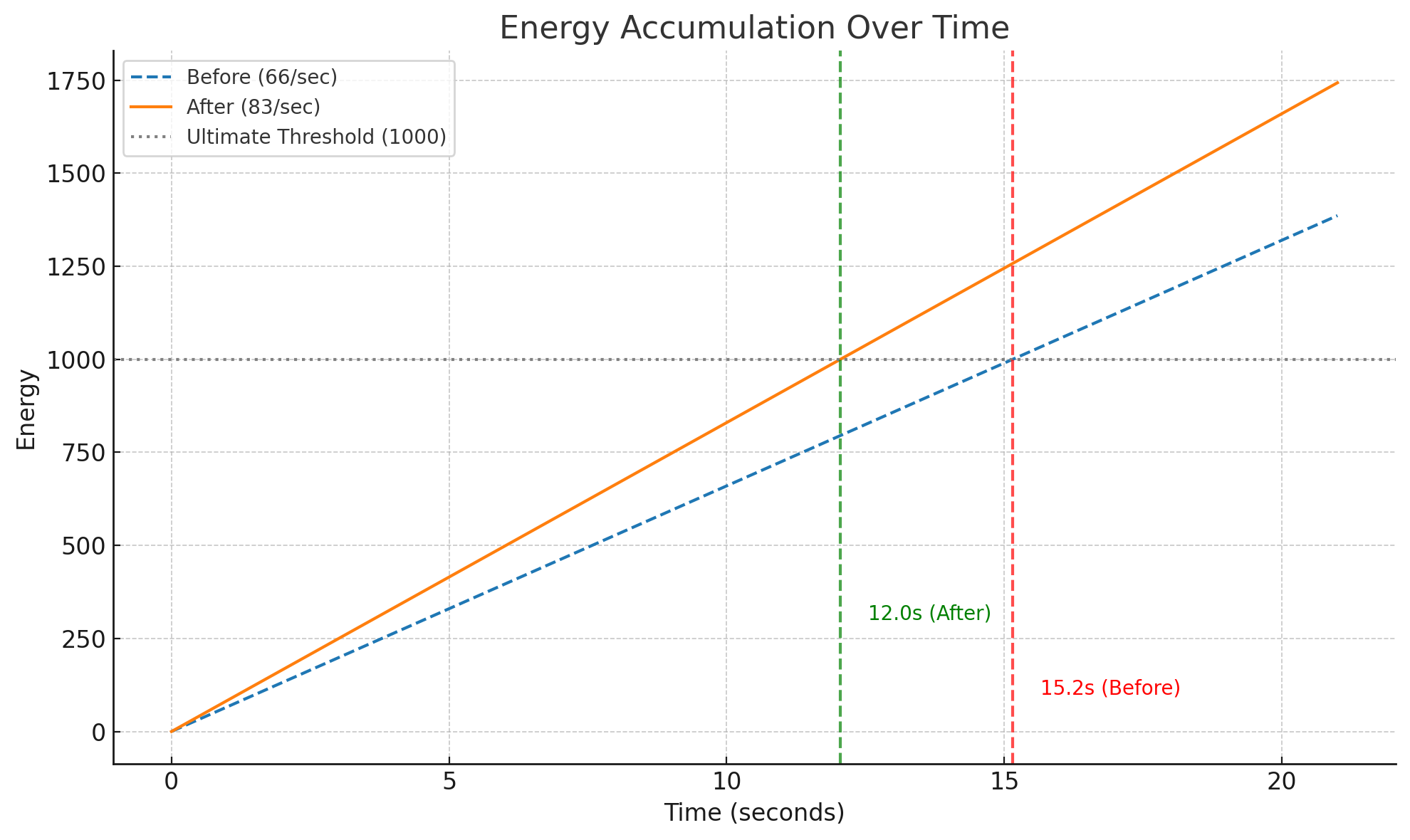 The graph below is based on base energy regeneration only. It does not factor in Immortal level, talents, buffs, or energy-boosting skills.