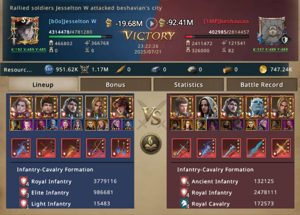 And it's good! With this great hit, beshavian's lord was in Jesselton's hands and his power dropped by nearly 100 million. That's when 1MP alliance members, activated their alliance tower and the enemy was instantly back under protection. Jesselton was very happy with the results, especially with the attack on the second target, because of his crazy good commanders and advisors. Jesse thanked his team for supporting him in this blood bath and it was finally time to go back home. And with this, Jesselton W is again closer to his goal of reaching 2 billion merit. When will we see Jesselton again?