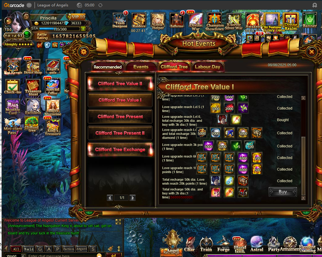 In "Clifford Tree Value I" we can buy "Pink Enchantress Crest" with 2000 Diams if we recharge 50k diams, but the value is at 500 000 Diams in Hot Events.