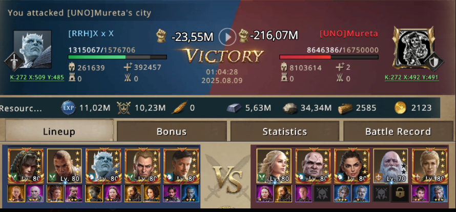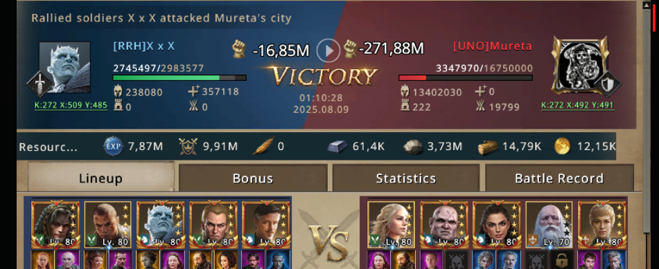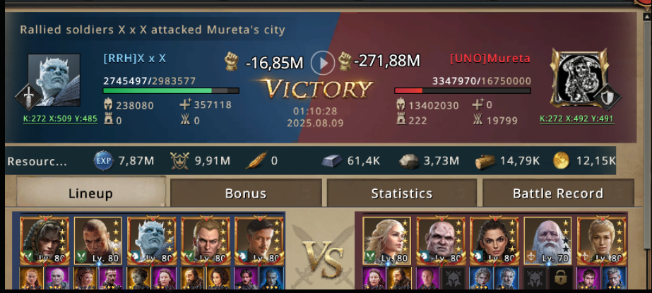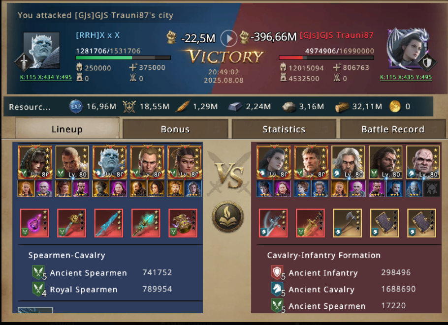 EVO’s proper F5 Spear Weakness build, perfectly countering the enemy’s cavalry-heavy Cavalry-Infantry setup. EVO's main forces, Ancient and Royal Spearmen, directly exploited their 1.68M Ancient Cavalry. The enemy ran a double weakness commander setup with Enzo and Drake, which diluted their offence and left them vulnerable. Result: you lost 22.5M power (250K dead, 375K wounded) versus their 396.66M loss (1.2M dead, 4.53M wounded). Strong troop-type advantage, effective commander synergy, and focused countering secured a decisive victory, overwhelming their formation and troop composition despite similar overall army strength. But Evo also had a good number of red weapons, meaning a good amount of base attack of the spear. Now it was time to attack him again and move to the next target to get all the relic pieces that would make him invincible in the battle with anyone of the same caliber. that he can use the relic as a trump card.