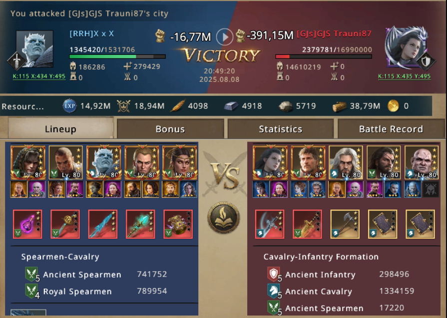In the second strike on the target, EVO maintained optimised F5 Spear Weakness commanders, directly countering the enemy’s cavalry-infantry setup. EVO's Ancient Spearmen and Royal Spearmen overwhelmed their Ancient Cavalry. With strong red-boosted gear, EVO dealt massive damage while sustaining moderate losses: –16.77M power compared to their –391.15M power loss (1.46M dead). This was a clear example of formation advantage, commander synergy, and gear efficiency. Following this victory, EVO obtained the desired relic piece from the target, so the attack campaign ended, conserving troops and avoiding unnecessary further engagement.