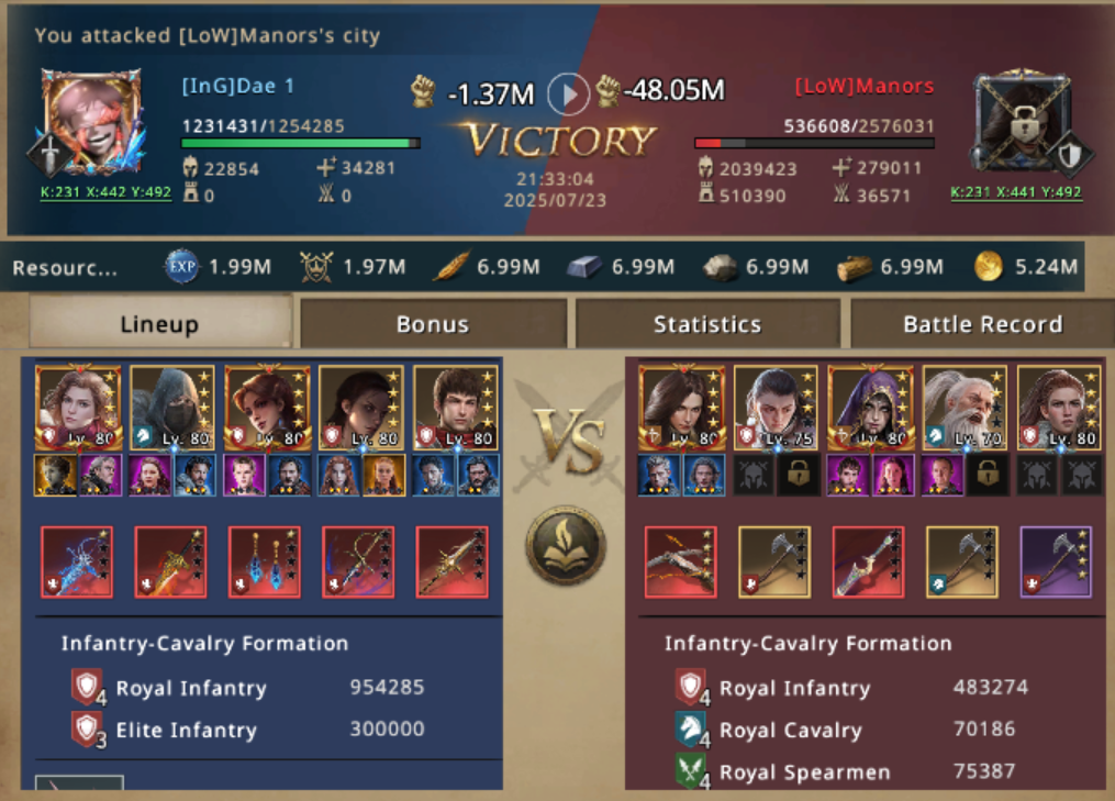But then, in between those attacks, there was another, much tastier target on the radar. A castle in appearance only at low level—2.5 miilion total troops, with an enormous amount of T4 hidden underneath. His scouts guaranteed him: mixed wall lineup, but badly set up for actual resistance. The lord was Manors, a quiet, unassuming player from a weak alliance, who did not use formation tactics but just bulked.