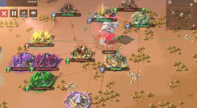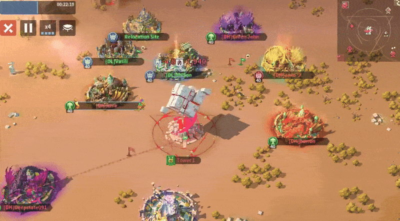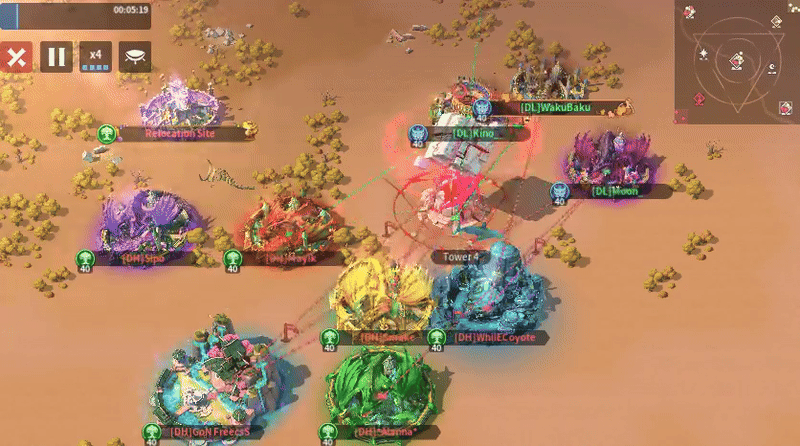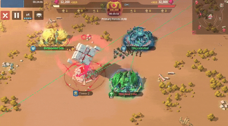 At Tower 4, DH destroyed a relocation, giving them a six-to-two advantage. They immediately attacked the tower and captured it two minutes later. One more DL member showed up to help, but he should have gone to Tower 1 instead because Tower 4 was a lost cause. DL was trying to rally with two players while DH was rallying both players. The best thing for DL to do when outnumbered is just to send solo attacks and hope you get some hits in before you get zeroed. DH made short work of the three enemies, and a couple started moving towards the center.