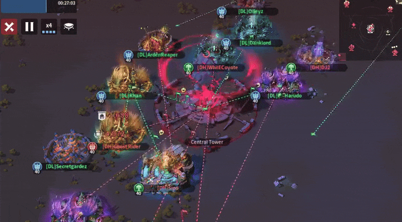 At the same time, DL was committing so hard to try to take the Central Tower that no one was coming to help at Tower 1. DL had only three players attacking the tower, and because DH was doing more with less in the center, DH also had more players at Tower 1 at seven. DL held out well for a while despite having so few players around the tower. Those at Tower 4 should have given up and gotten zeroed earlier so they could relocate to help at Tower 1. DL tried their best, but just could not make a meaningful impact at the tower.