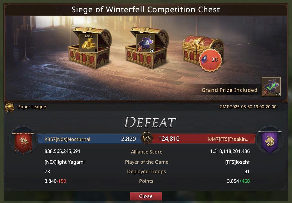 So yes, it’s another loss in this SoW season. But from where I’m standing, it shows N0X is growing in strength compared to our rivals. If we keep this up, keep learning, keep developing our accounts, then soon enough we’ll be able to trade evenly with even the strongest alliances in the game.