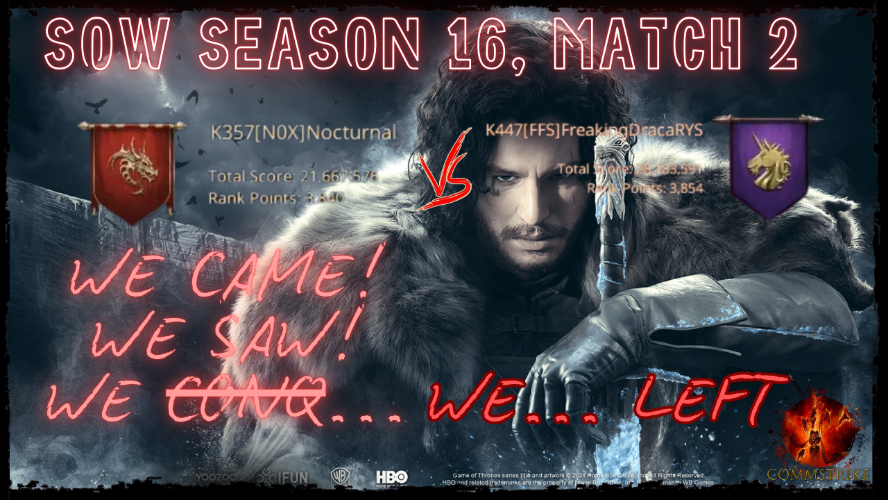 Coming off our first match in N0X, spirits were sky high. Beating WAO was a clear win in our favor, propelling us straight into the top of the charts, exactly where the biggest monsters of SoW live. Of course, that also meant the honeymoon wouldn’t last. For the second match, we knew the odds were high that we’d be thrown against one of the ultra top alliances, and the outcome would be… less than ideal for us. Still, hope is free, and hope we did!