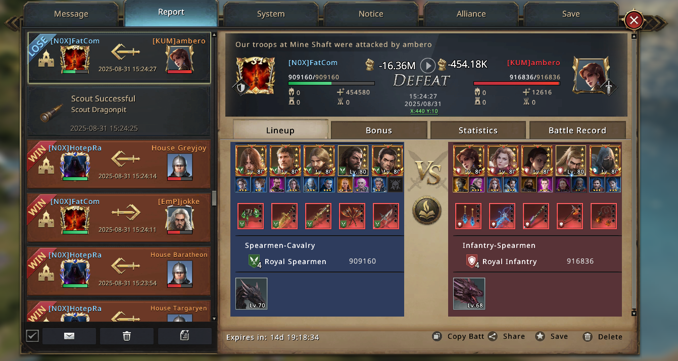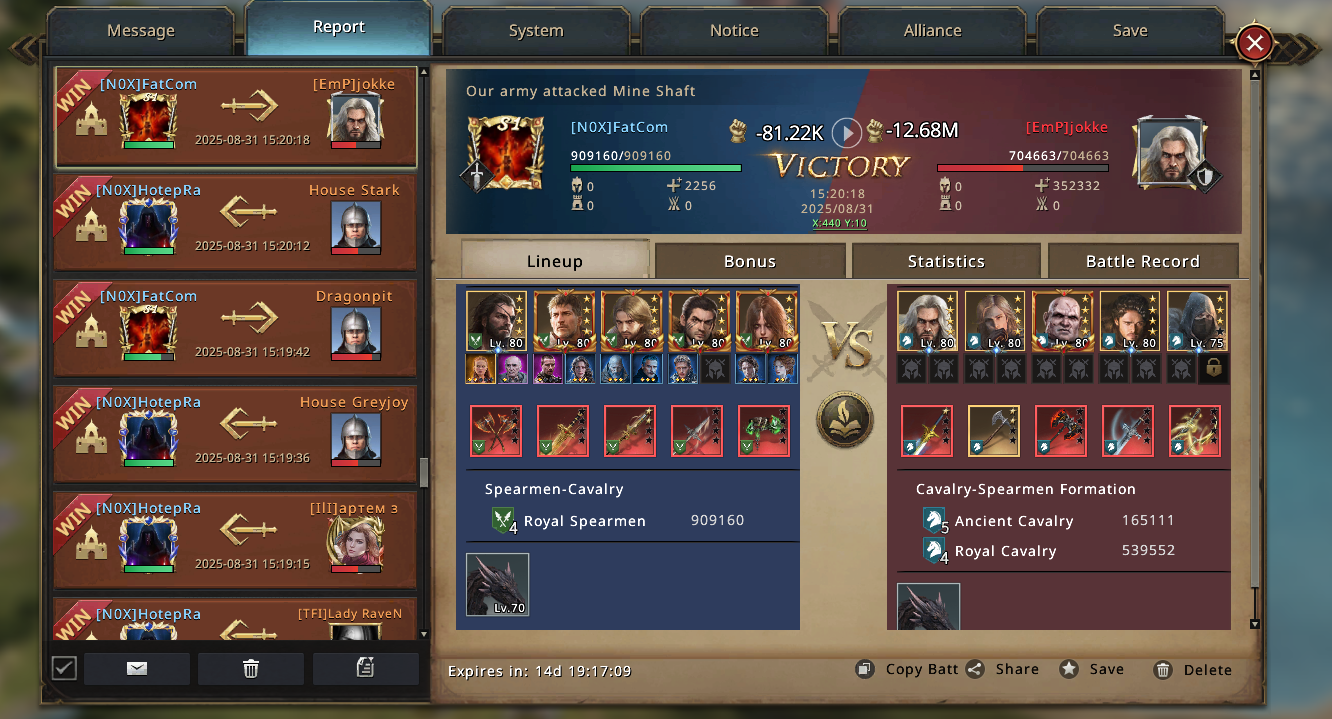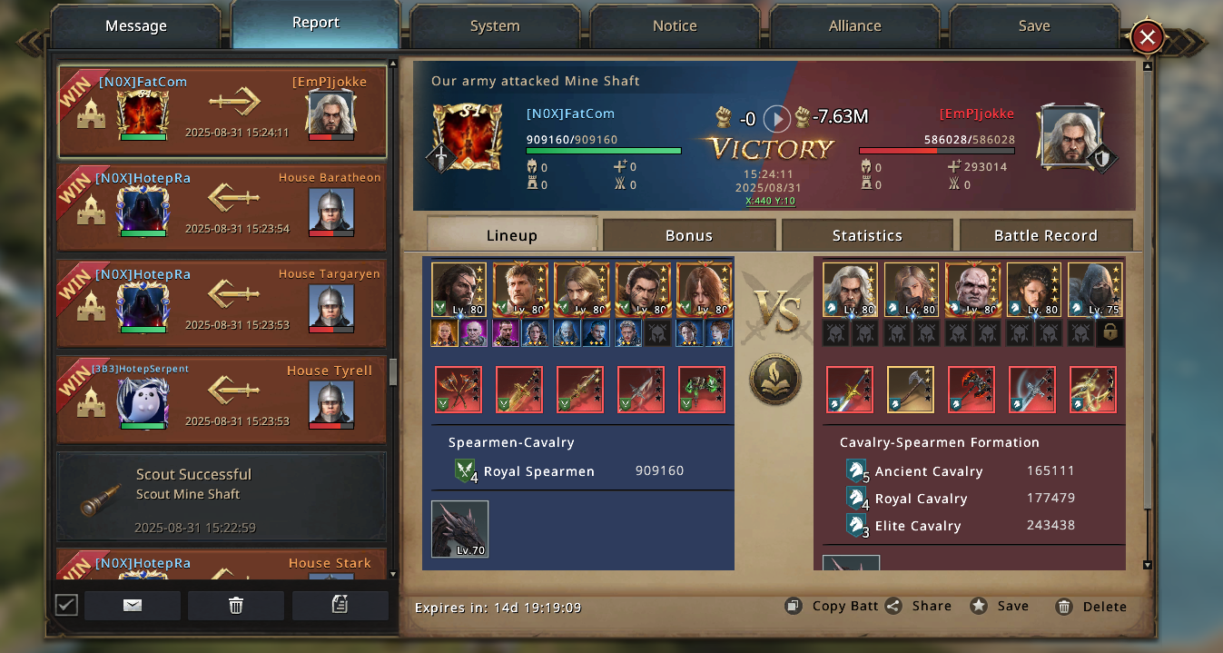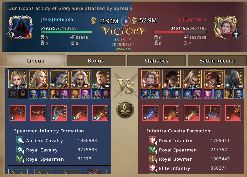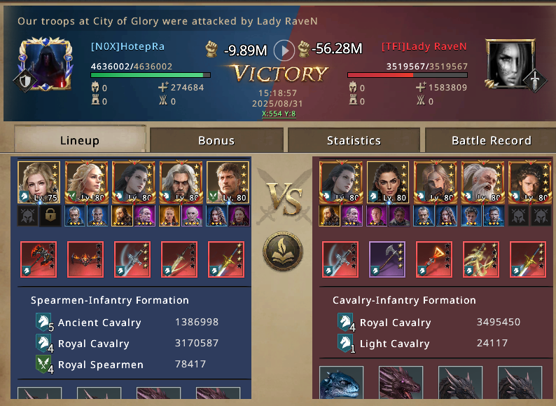 With the City of Glory secured, smaller waves of attackers crash against us and break. Inf accounts bounce off, hybrid setups crumble, and even the bigger Cav players sacrifice their troops with no real results. From now on, the City of Glory becomes our anchor, the center of gravity around which the rest of the match begins to tilt.