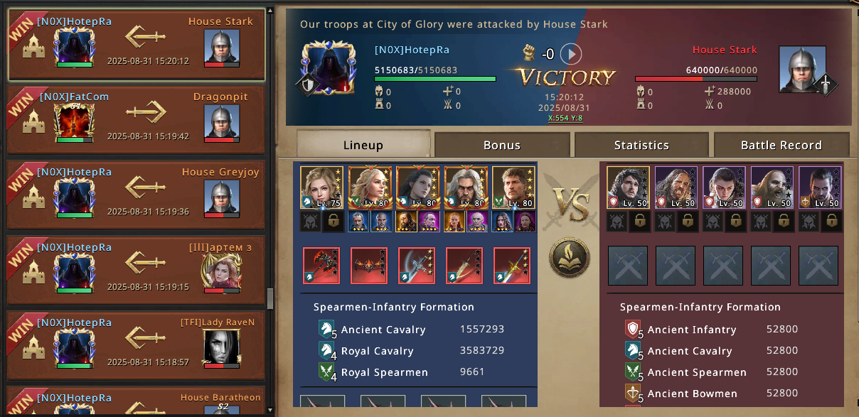 As pressure ramps up and I’m running wild across the map, the City of Glory finally opens. Our lead launches the rally, but I’m so caught up defending another altar from a sneaky Baratheon that I almost miss it. In the last seconds, I send my march, managing to both defend the altar and joining the City rally at the same time.