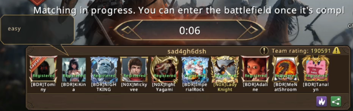 As the autumn approaches Westeros, the season 4 of Arena of Honor is progressing and [N0X]LadyKnight and the team are getting closer and closer to the Glory King rank. While getting there it's not such a hard task for them, keeping 'it for the whole season might be a close to impossible task as the season progresses the team will have to face stronger and stronger enemies and defeating them might prove challenging. LadyKnight is taking each round very seriously and despite round 5 happening just 1 week after round 4 instead of 2 weeks as per usual, she used every second of that time to try and improve her battle stats, troops and dragons. She managed to get a few upgrades just in time, as the days passed quickly and it was already Sunday morning and time for her to head to the Arena of Honor battlefield. Once she arrived there, she signed the pre-registration papers and after Tominy registered the team they all waited patiently for the matchmaking to be completed by the Old Gods.