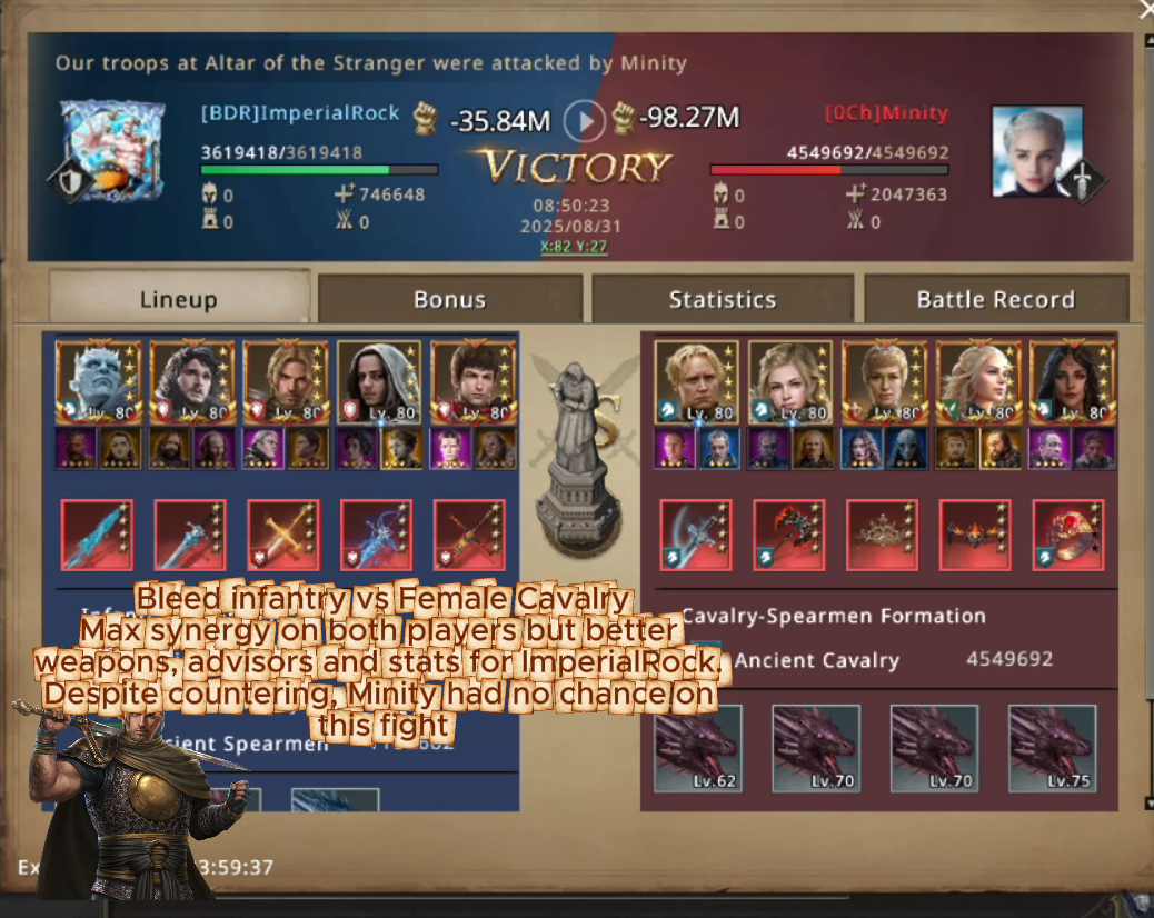 House Stark should've known better than to challenge ImperialRock as their rallies got decimated within seconds and the altar went into House Targaryen's possession after a few minutes. However, there was no time for celebration as more and more altars opened that required the team attention. Beside reinforcing others, LadyKnight was also looking for targets she could solo and while there weren't too many warriors of her level on the battlefield, scouting started to pay off soon enough.