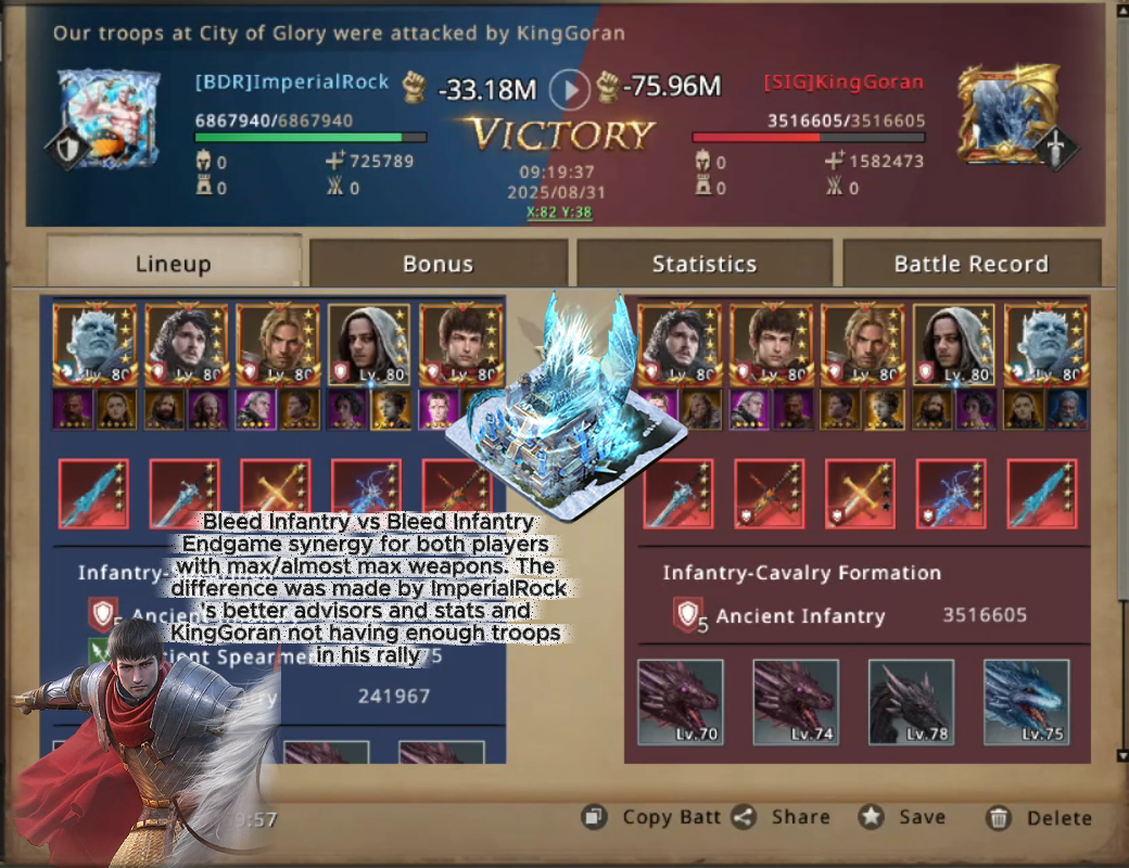 As always, ImperialRock took up to the challenge and quickly kicked the neutral NPCs from the city with a solo attack and then everyone in the team reinforced and braced for impact. And the impact didn't let them wait, as all the other houses started rallies to try and stop House Targaryen from winning. Minity and NIGHT KING, KingGoran and Black Bear were among the strongest enemies, so the city had to be fully reinforced for fight those rallies, however without catapults, every minute the city of glory was hit and 5% of the troops inside killed so the members had to reinforce between catapults hits too not just between rallies. Despite having more than 10 million troops under his command, the vale where the City of Glory was located was quite narrow and only like 6 million troops were able to fight at once for defenders while the attackers had room to hit with their rallies in quick sequence. Once the rallies started hitting you could hear the valyrian steel weapons clashing from far away, soldiers were giving their life on both sides and the snow around the city was quickly turning red.