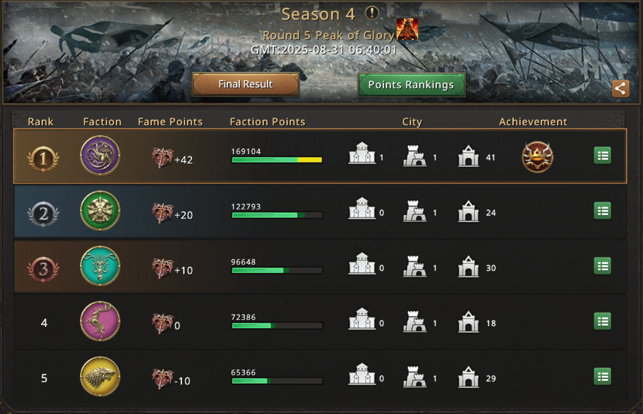 The rallies were hitting relentlessly without any breaks and that gave the fantastic 10 team a very hard time reinforcing after every rally wave and after catapults hits, but they did 'it valiantly and despite continuously rallying and even managing to break the House Targaryen defenses a few times, ImperialRock's strength combined with on point reinforcements coming from the team managed to secure the City of Glory with just a few minutes left from the round.