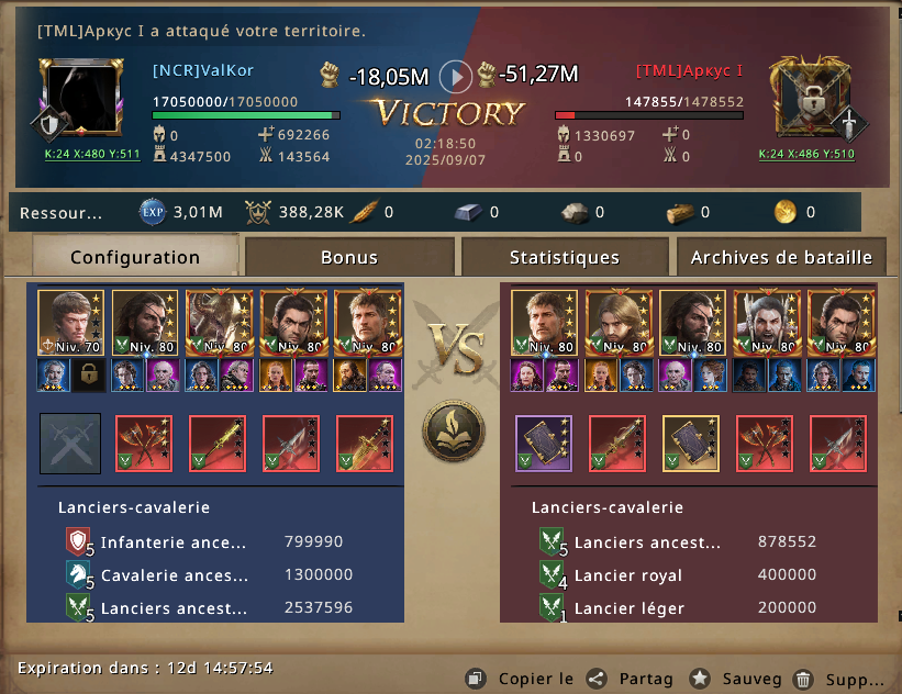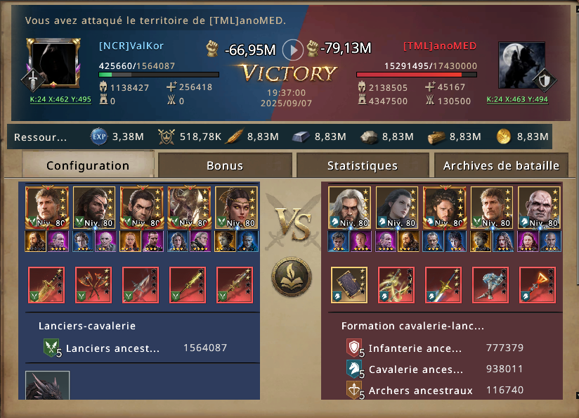 The tension rose a notch. Seeing AnoMED camping in the middle of King’s Landing, ValKor decided to strike even harder. With a full T5 army, he dared to face the mountain. The battle was titanic. ValKor’s march barely made it through, but the impossible became reality: 66M for ValKor against 79M for AnoMED. A dazzling, almost legendary victory.