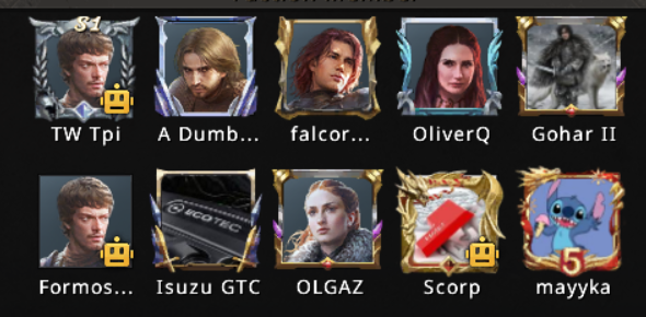 Once the matchmaking was completed, battlefield doors opened, and everyone stepped inside to see for which house they'll fight and against whom. OliverQ was chosen by Margaery Tyrell to fight for her house this round along [KAW]TW Tpi, [TFi]A Dumbledore, [tNt]falcor1963, [KTW]Gohar II, [CTW]Formosa TW, [Uws]OLGAZ, [WAK]Scorp and [KgK]mayyka.