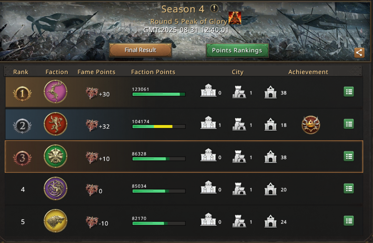 To everyone's surprise they managed to somehow reinforce properly and hold the city and with not enough time for anyone else to take'it from them, they managed to jump from 6th place to 2nd place in the fight. This shown once more if it was needed that you should never give up in Arena of Honor and just play all your possible outs.