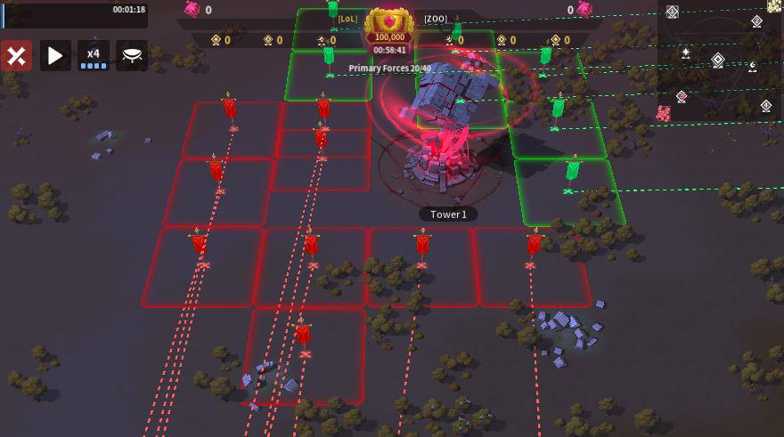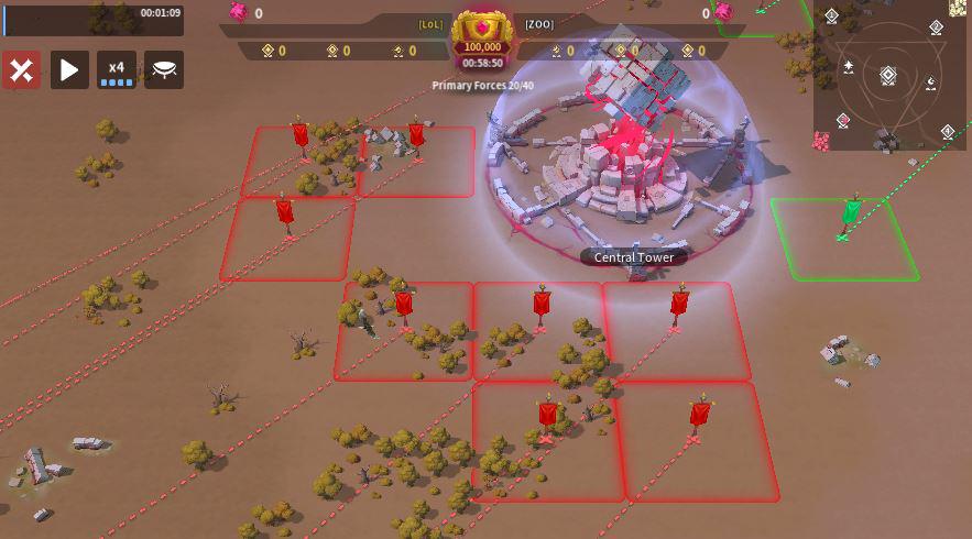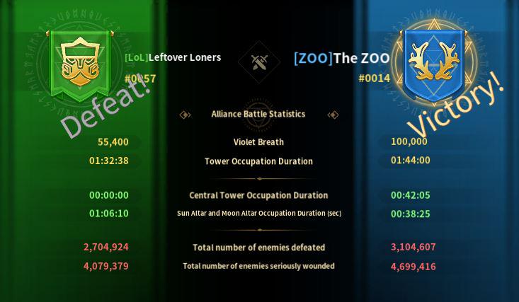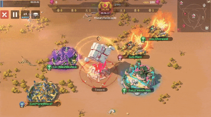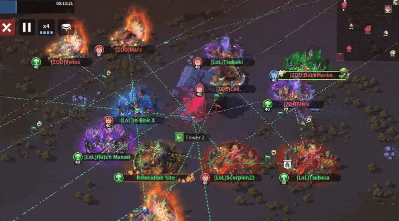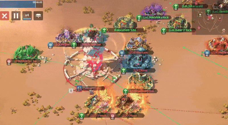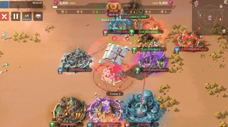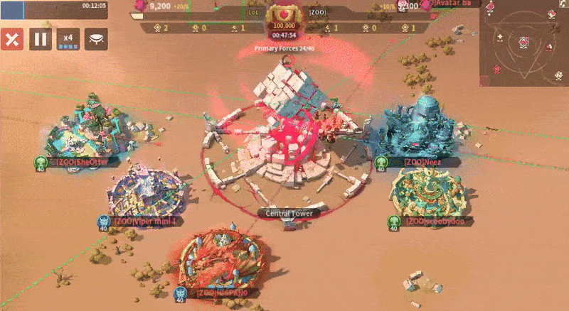 In the center, ZOO bombarded their closest target with a combination of solo attacks and rallies, quickly zeroing him before another LoL player landed beside the last defender. LoL attempted to send several more players toward the objective, but ZOO intercepted their relocations and destroyed them before they could provide support. With both defenders eliminated and reinforcements cut off, LoL had no presence left at the tower. ZOO maintained complete control and secured the Central Tower uncontested at the 13-minute mark.