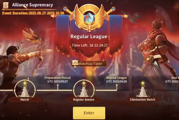 The Alliance Supremacy event is a large-scale cross-server tournament where alliances compete through multiple battle stages to determine the ultimate champion. The event spans 10 days and consists of a 1-day waiting period, a 5-day regular season, and 1-day rounds for the top 16, quarterfinals, semifinals, and finals. To qualify, alliances must be level 6 or higher, have at least 45 active members, and an alliance power of 120 million or more, with the top 48 alliances ranked by power eligible to participate. Matches are fought in three lanes, with each alliance deploying up to 20 teams per lane, and victory goes to the side that wins at least two out of three lanes. The regular season divides alliances into groups of six, with the top two from each group advancing to the elimination rounds, where a best-of-three format decides the winners until the champion, runner-up, and third place are crowned. Rewards are given daily during the season, with final ranking rewards distributed after eliminations to participating members.