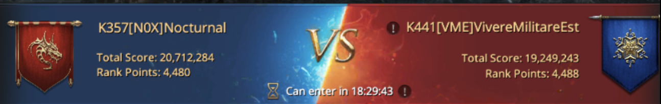The Old Gods choose to give [N0X] some hopes by matching them with [VME], an alliance that was almost equally strong to [N0X] but an alliance that had a few of their strongest people move to bigger alliances that qualified to the playoffs even before the last round. Despite that [VME] still kept quite some strong warriors on their roster and the match was announcing a hard one for [N0X], especially since they had to get a very convincing win. Now that the opponent was knows, the [N0X] leadership got the strategy they had and did a few last-minute polishing on it and then everyone in [N0X] got their best troops and commanders and headed towards the Siege of Winterfell battlefield. Once they arrived there the battlefield gates opened and everyone from both the alliances started joining in, there were so many warriors, each of them bringing millions of troops and it was looking like the battle it's going to be an epic one.