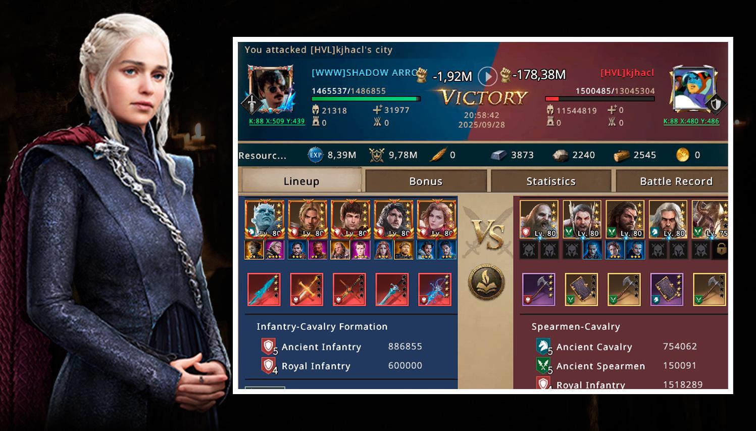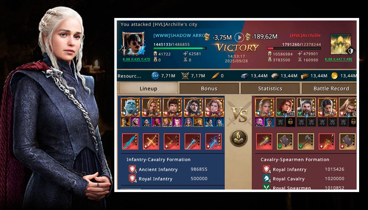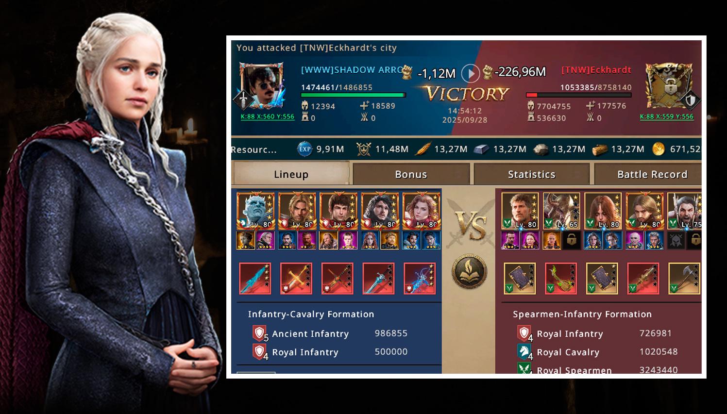 Shadow quickly donned his battle gear and prepared for the first attack. With a powerful infantry formation led by Night King, Vorian, Daeron, Jon Snow, and Sinara, the legendary Shadow Arrow made it clear that he was there to bring destruction.