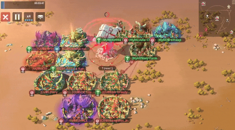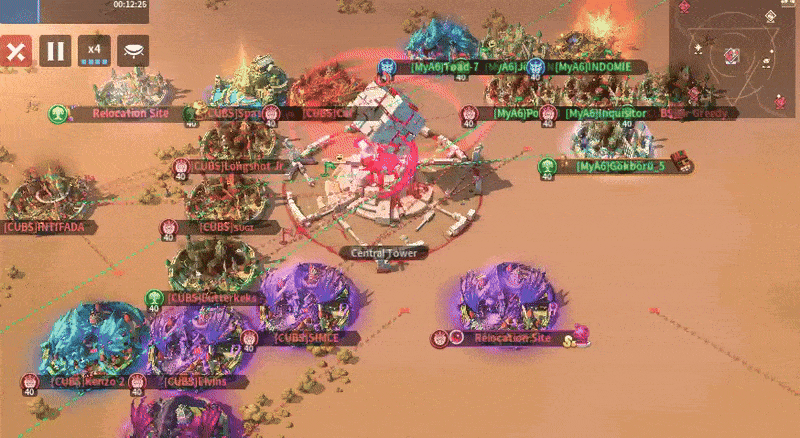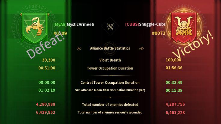 CUBS destroyed one MyA6 relocation instead of the other, which meant MyA6 had assigned players to incorrect positions. CUBS focused a single target and zeroed him, while MyA6 failed to break through with solo attacks and instead relied on slow rallies. As CUBS dealt damage across multiple targets, MyA6 attempted to focus down one player and eventually zeroed a CUBS with their rallies, but CUBS immediately answered with their own response. CUBS then activated Quick Occupy and stacked the tower, capturing it seven minutes into the match. A CUBS member relocated behind MyA6 and MyA6 failed to destroy the relocation, allowing CUBS to attack from both sides. With pressure from both angles, CUBS cleaned the area and wiped MyA6 from the objective.