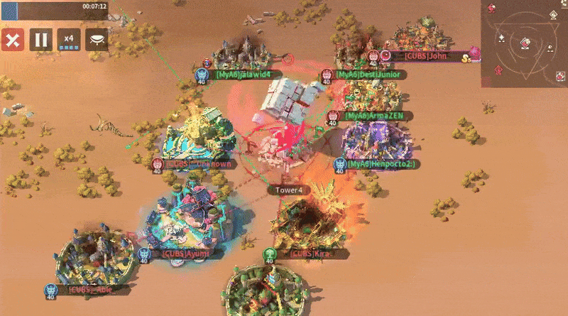 CUBS committed six players to the Central Tower with one overlap while MyA6 sent nine with one overlap. CUBS should have conceded Tower 4 to secure the center but gambled on MyA6 not exploiting their positional advantage, which left them undermanned in the middle. Against weaker teams, committing fewer players to the center early can be manageable because they can stall until rotations from a side objective arrive, but here MyA6 has the numbers and spawn advantage and should prioritize focusing targets and quickly zeroing high value players before Tower 1 can rotate into the center. If MyA6 executes those priorities they should be able to overwhelm the tower once CUBS fails to draw sufficient reinforcements.