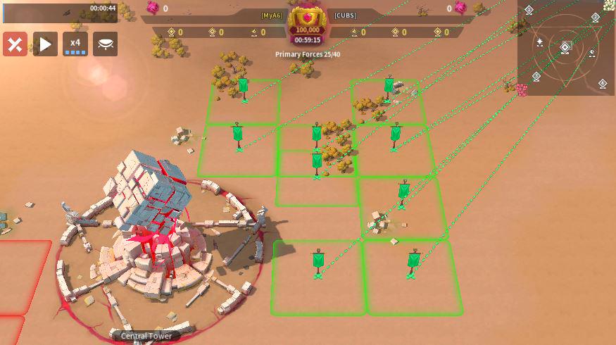MyA6 struck first by zeroing a CUBS player on the bottom side of the central tower and leaving another on the left side one hit away from being zeroed, though they could not finish her until they rallied a few minutes later. Conversely, CUBS was not dealing as much damage early on. At the 5 minute mark late arrivals from CUBS spawn points and Tower 1 began arriving at the scene. Both sides traded blows, but only CUBS kept sending players into the center to replenish their forces while MyA6 steadily depleted. CUBS reinforcements from Tower 4 also showed up, and by the time the tower opened CUBS was methodically overpowering MyA6 and compressing around the objective. At the 13 minute mark CUBS captured the tower on the strength of their numbers advantage, and several players began relocating back to their home tower even as MyA6 started to send fresh reinforcements to contest.