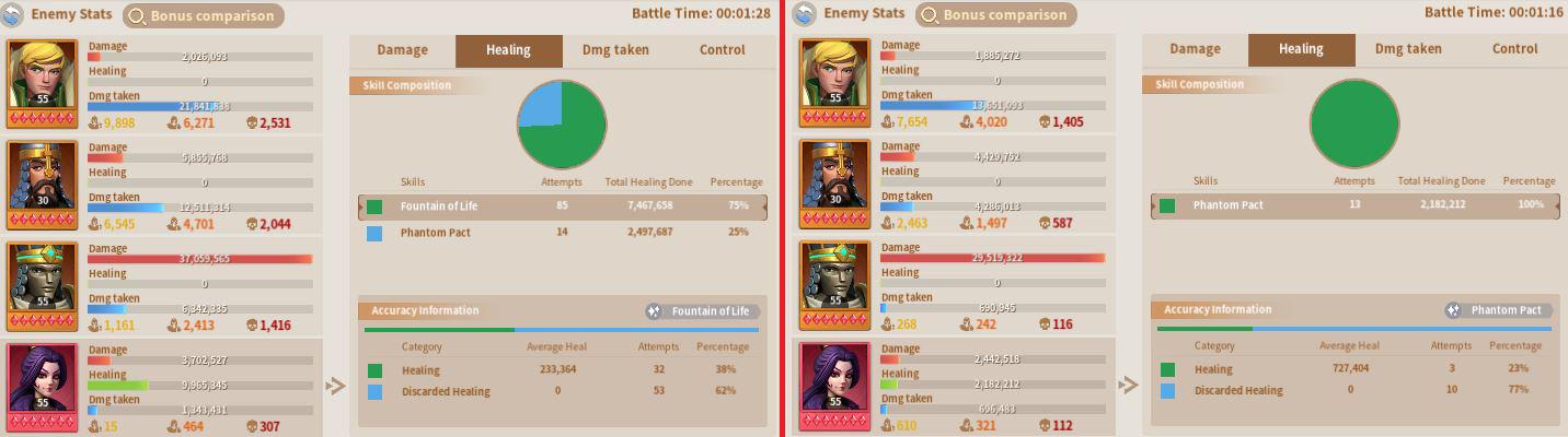To evaluate Phantom Pact’s healing performance, I focused specifically on the healing output attributed to Nine Tails, since the skill’s restorative effect counts as her healing even when it targets other allies. Across multiple tests, Nine Tails’ total healing ranged between 2.1 million and 2.4 million, which is roughly comparable to what Fu Fei typically produces under similar conditions. In the broader context, however, this level of healing is relatively modest. While Phantom Pact provides valuable utility through cleansing and passive trigger support, its direct healing contribution is not substantial enough to serve as a team’s primary sustain source. For players looking for stronger recovery, Fountain of Life remains a far more effective and cheaper option. In those same test conditions, Fountain of Life delivered roughly three times more healing, averaging around 7.5 million, making it a superior choice for teams focused on durability and long-term survivability.