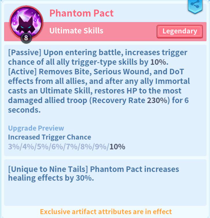 Nine Tails’ exclusive skill, Phantom Pact, is a Legendary Ultimate Skill that combines both passive and active effects. Upon entering battle, its passive increases the trigger chance of all allied trigger-type skills by 10%. Its active component removes Bite, Serious Wound, and DoT effects from all allies, and after any allied Immortal casts an Ultimate Skill, it restores HP to the most damaged allied troop with a Recovery Rate of 230% for 6 seconds. When equipped with Nine Tails’ exclusive artifact, Fox Spirit Pendant, the healing effects of Phantom Pact are enhanced by an additional 30%, further improving her team’s sustain and cleansing power. This combination makes Nine Tails one of the most versatile supports in the game, capable of both mitigating debuffs and maintaining strong healing throughout extended battles.