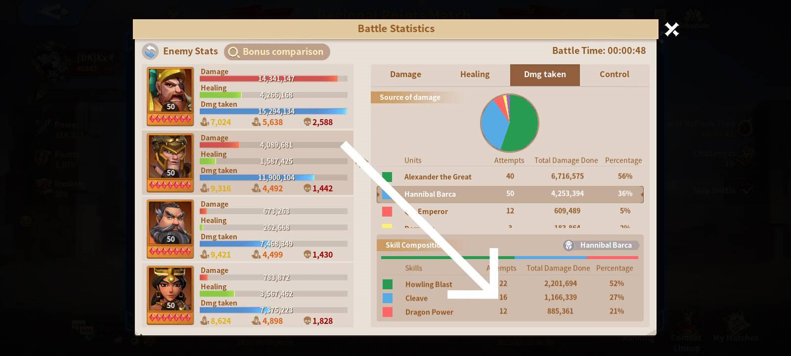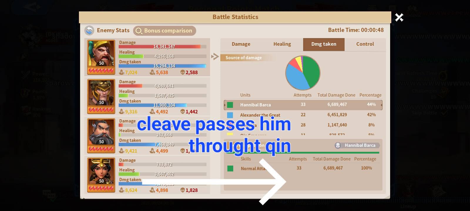 Simply — if you have a hybrid and you already put Cleave on Barca 🛡️, and you were against Fire Barca beside Hippo 🐎, and Alex ⚔️ beside William ⚔️ and Wu 🔥 after Hippo simply Cleave will hit 2 enemies 💥
