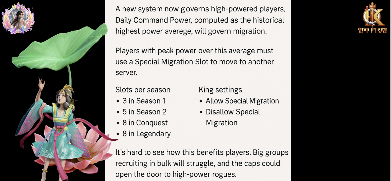 The new system seems to favor large, high-spender servers, leaving smaller or mixed servers without the tools to compete through planning and diplomacy. The transition from server-based to alliance-based registration, combined with migration quotas, also risks excluding free-to-play and lower-power players who fall outside the 180 available slots.