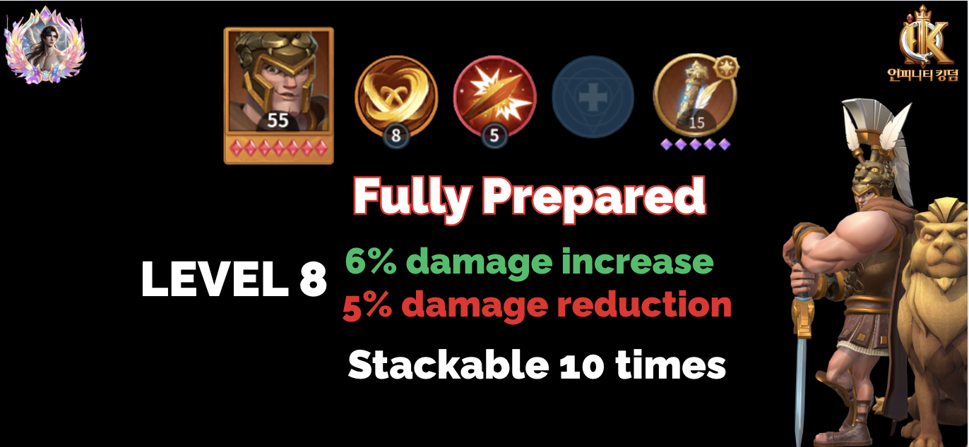 A new offensive skill enters the Tower. Legendary Skill: Fully Prepared: Each normal attack increases both damage dealt (6% at level 8) and damage reduction (5% at level 8), stacking ten times so potentially 60% damage increase and 50% damage reduction which is quite insane. It can’t coexist with Counterattack and works only for offensive Immortals.