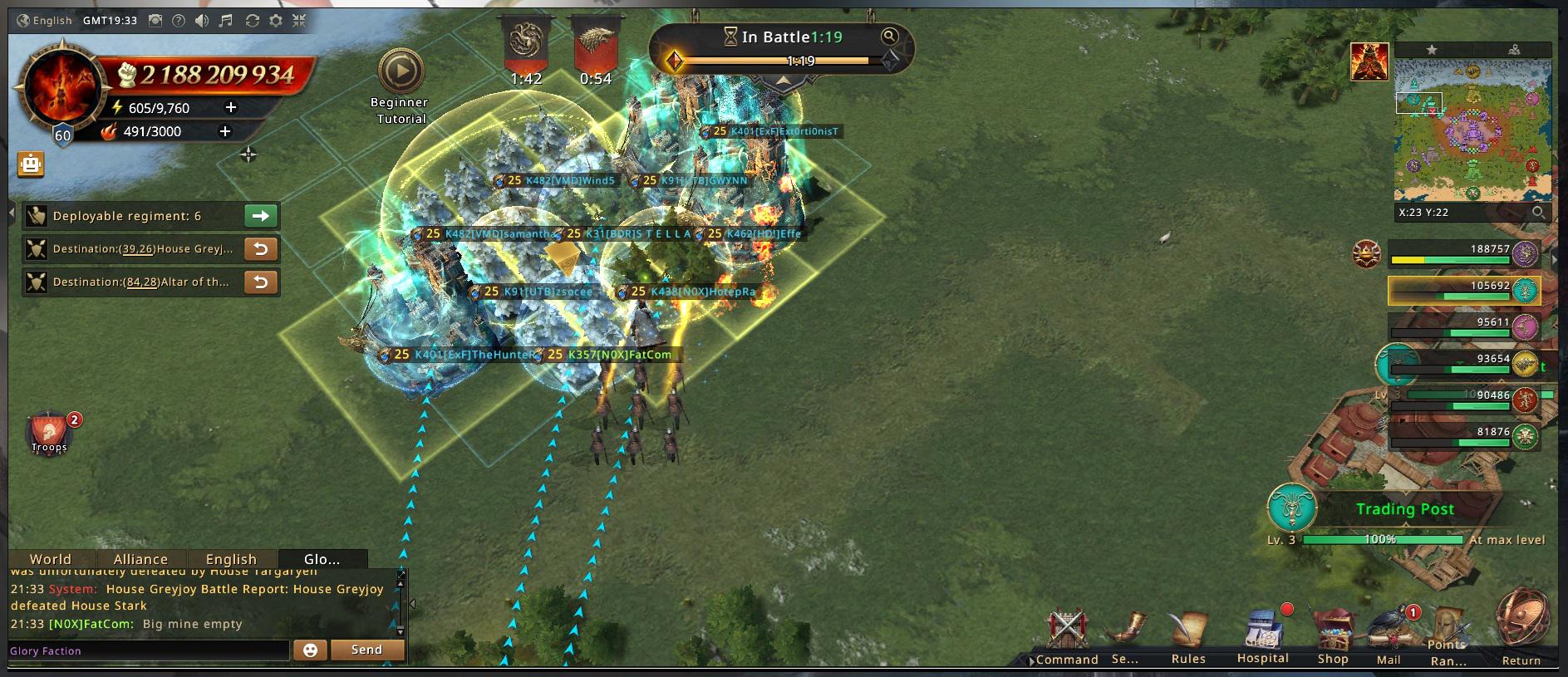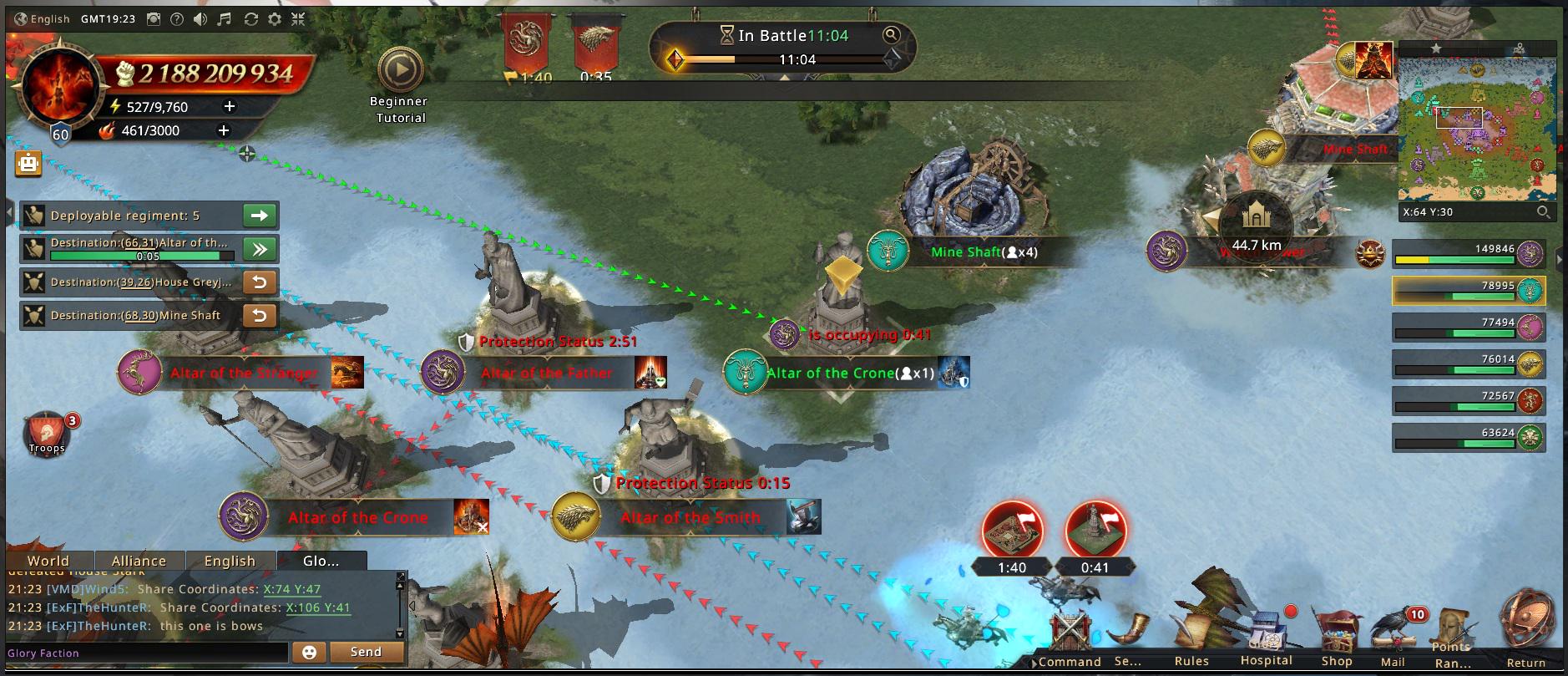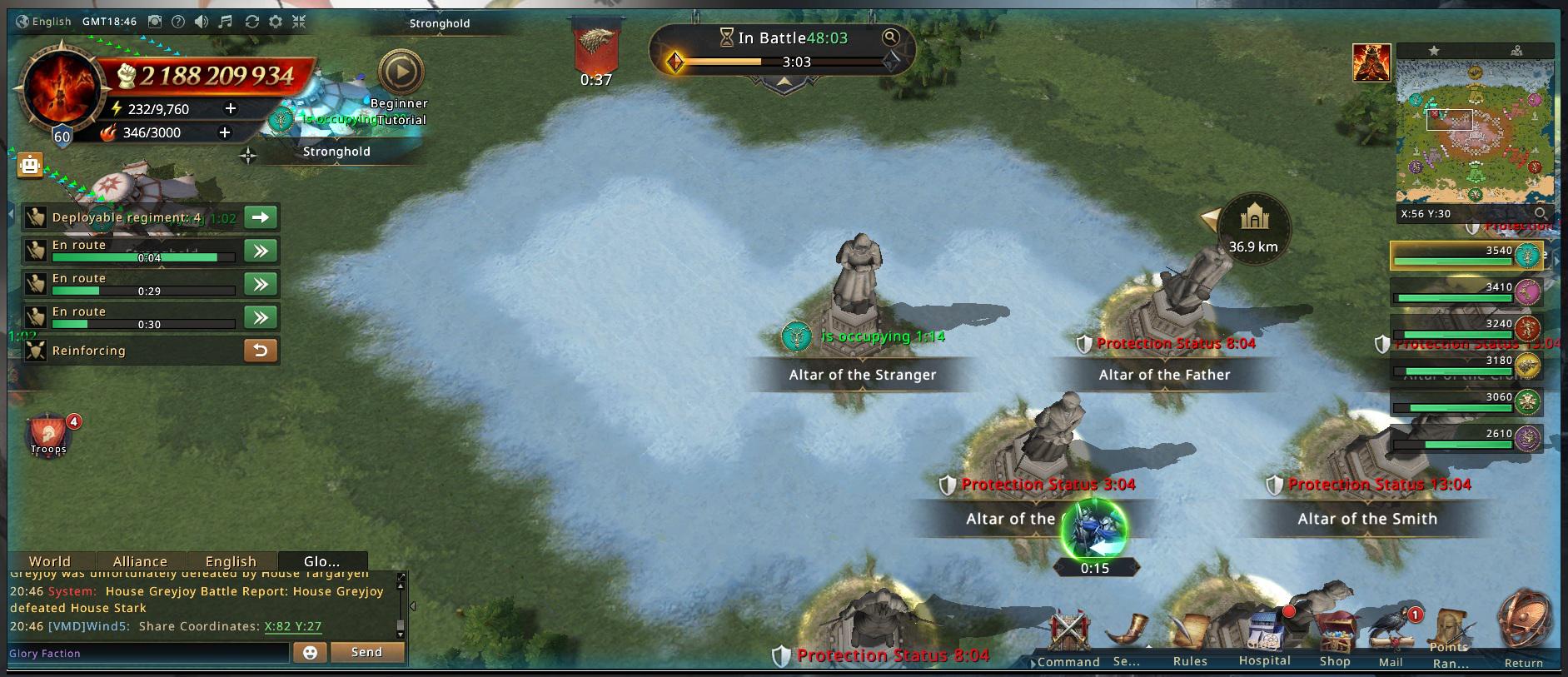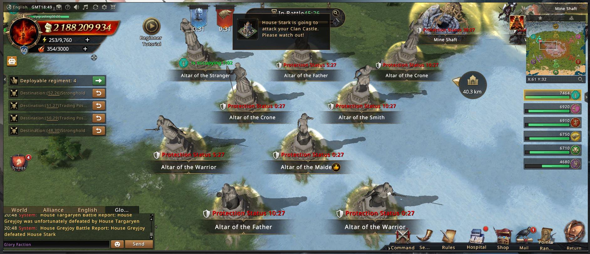 We rally hard on center, with two rallies and constant healing reinforcements, but that focus leaves everything else exposed. The other houses react quickly, attacking our Altars and trying to cut off our points. Soon, it feels like the entire map is against us. We’re defending center under heavy fire and losing ground everywhere else.