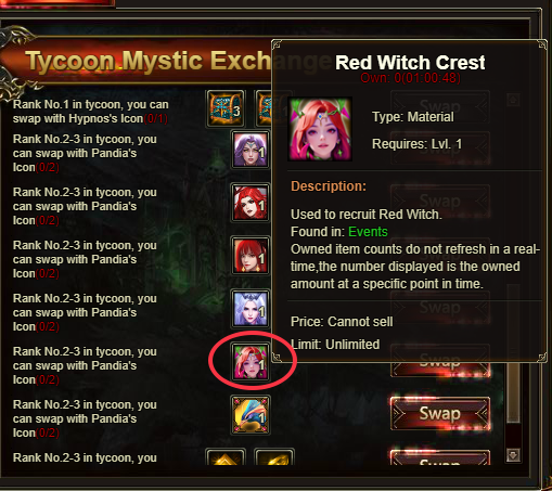 I have red witch crest and I want to swap Thanatos in the next cross server tycoon