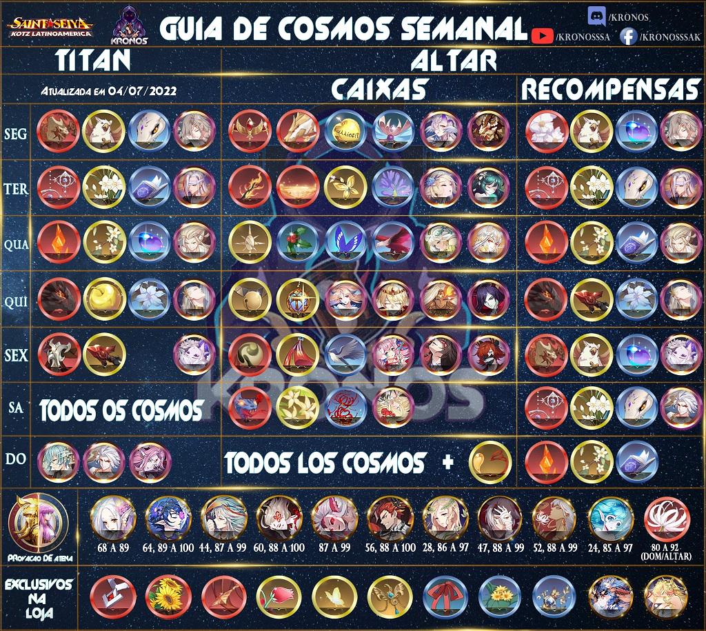 Puntos a destacar en este aspecto con la ultima actualizan que unieron los cosmos que eran premium y en este momento son muy usados quedaran varios días casi que FIJOS para el farmeo en ALTAR. Dichos días serian LUNES MARTES MIÉRCOLES Y VIERNES. Juntos los DOMINGOS que se farmean cualquier cosmo.