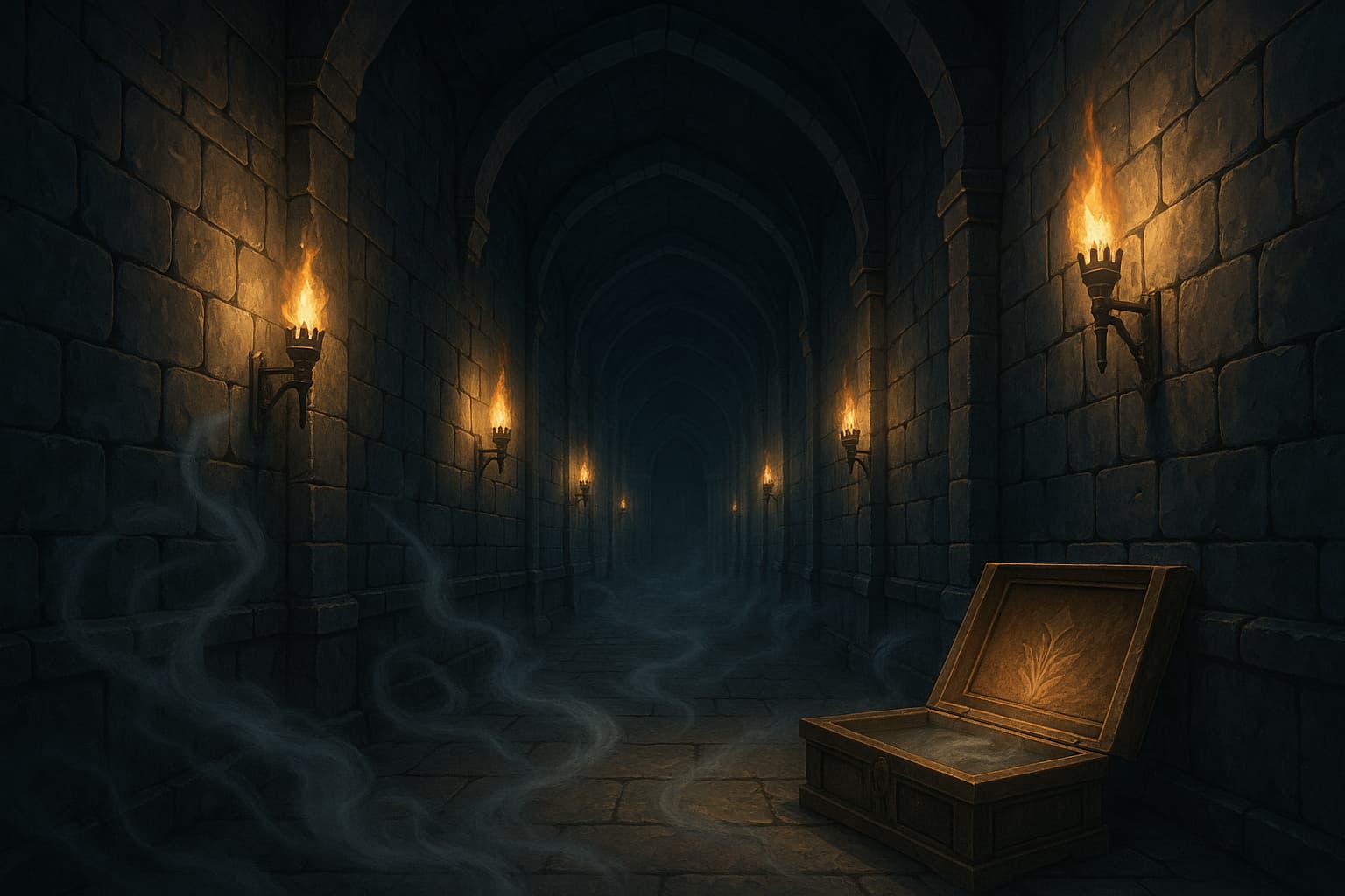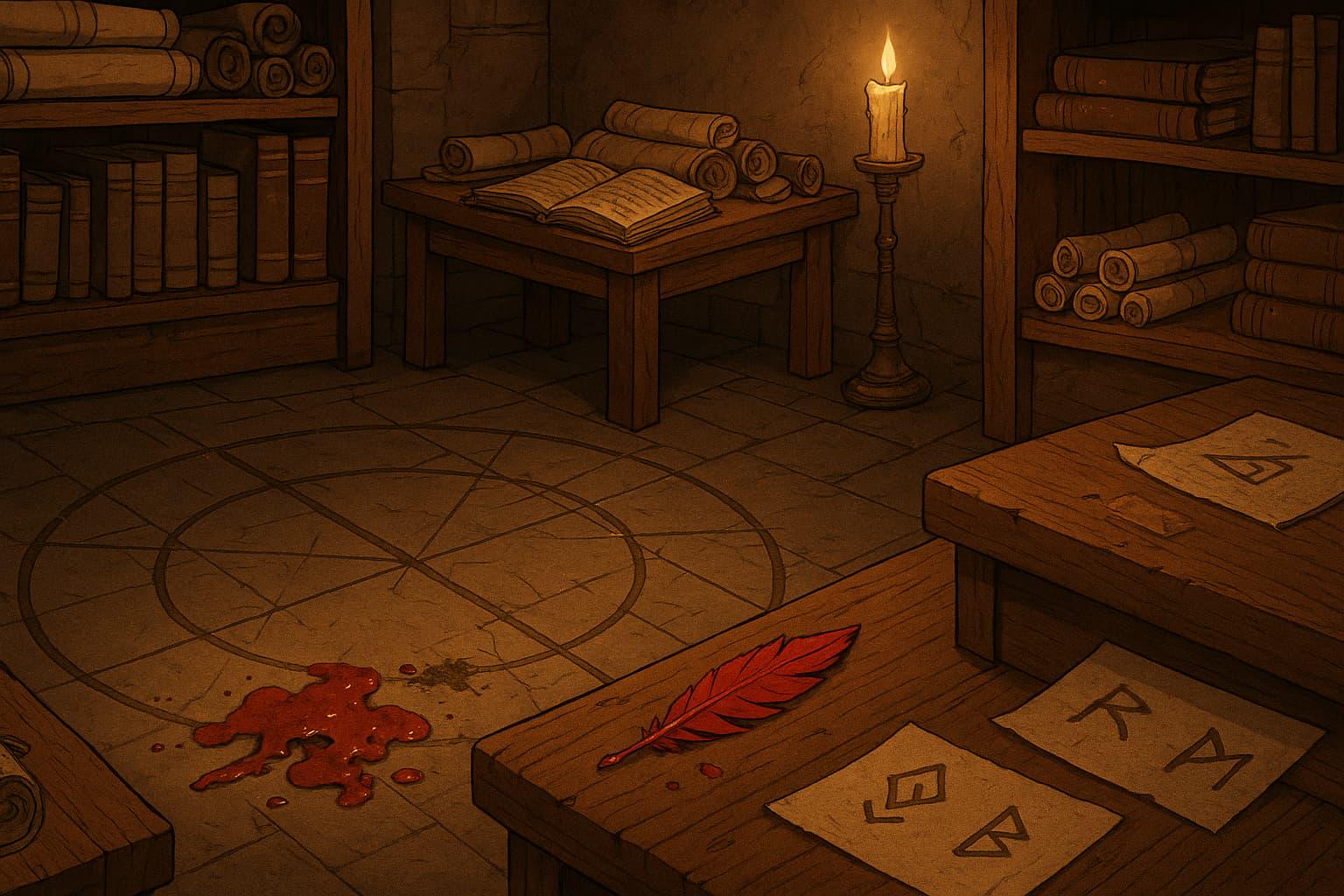 They descended into the under-halls, where the candlelight sank into centuries of dust. The smell of parchment and regret hung thick.
