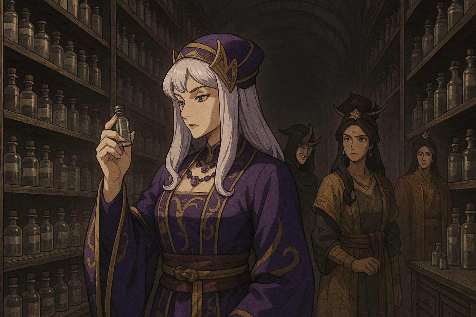 Himiko slowed, her hand brushing the air as if afraid to disturb it. The silence in the hall was not empty — it listened. She paused before a faintly blue vial, lifting it from its cradle with the caution of a priest handling relics.