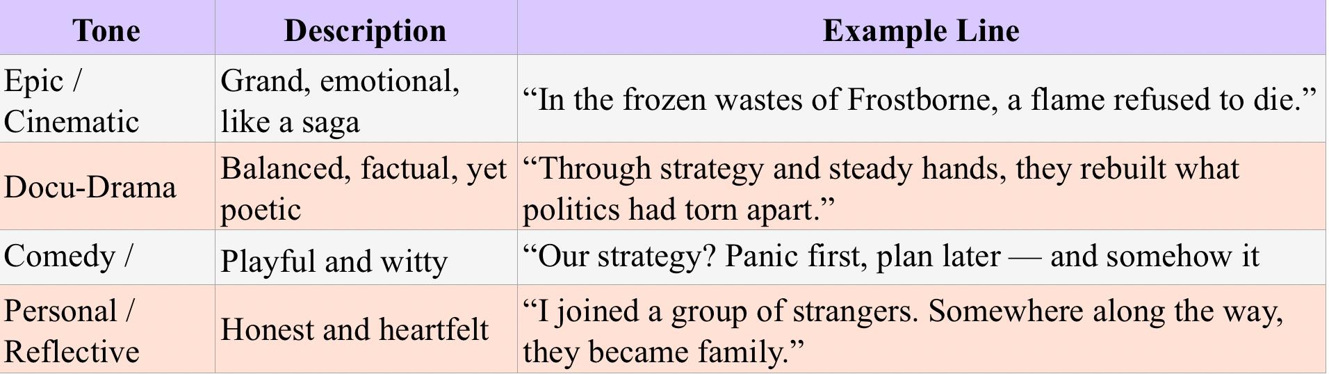 This guide will help you build the emotional heart, structure, and tone of your story. Whether you want it to feel epic, funny, like a documentary, or heartfelt, it’s got you covered.