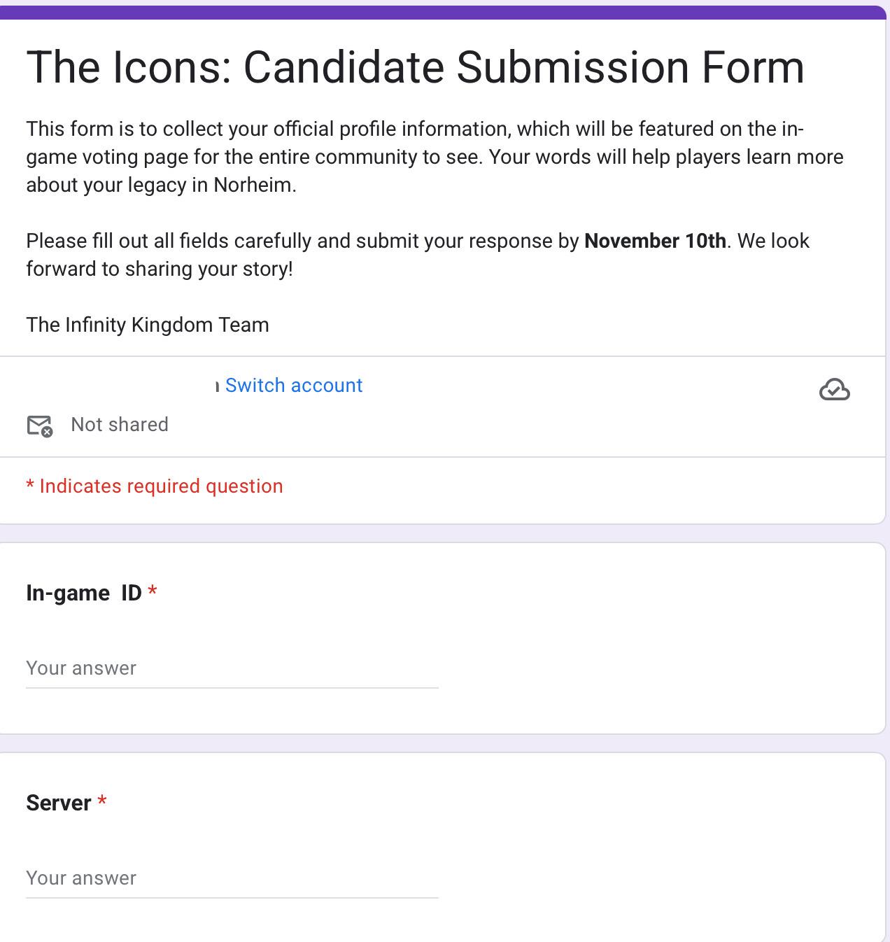 - Submit your profile (Your Name and Server) in the form (link posted below)