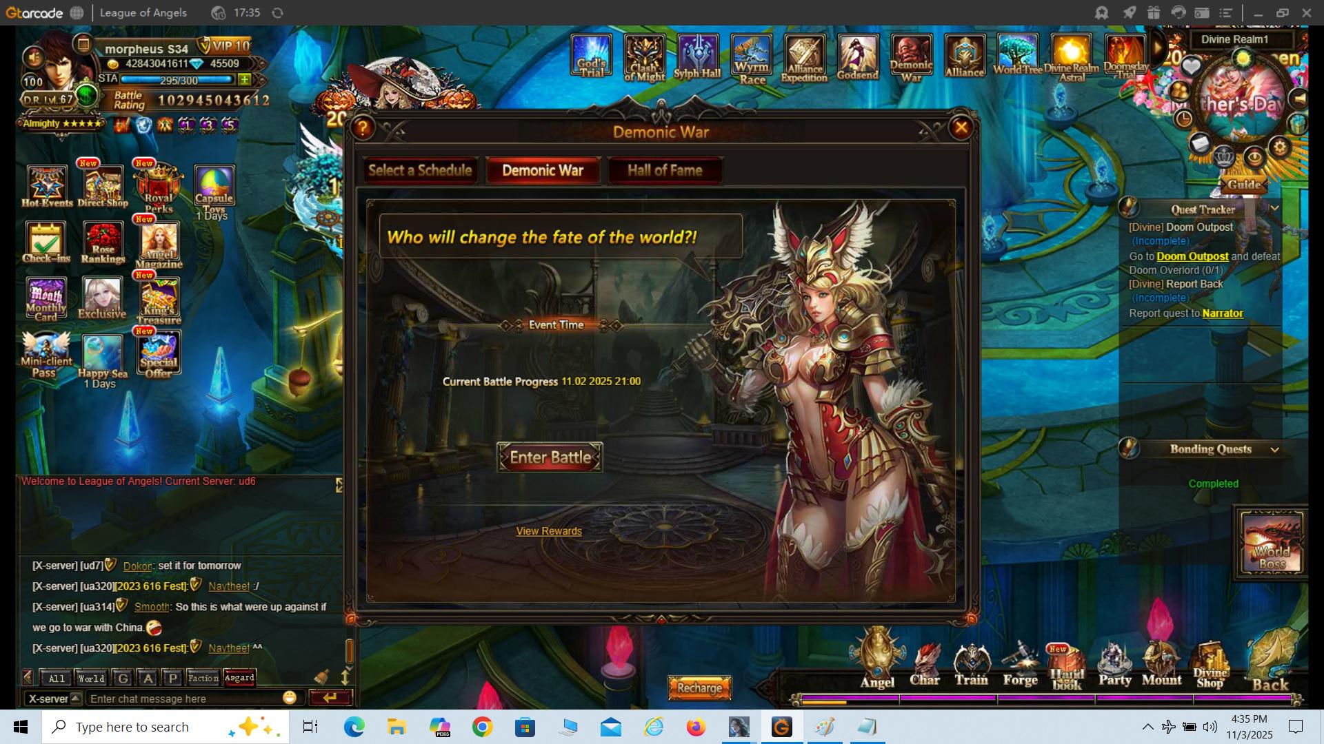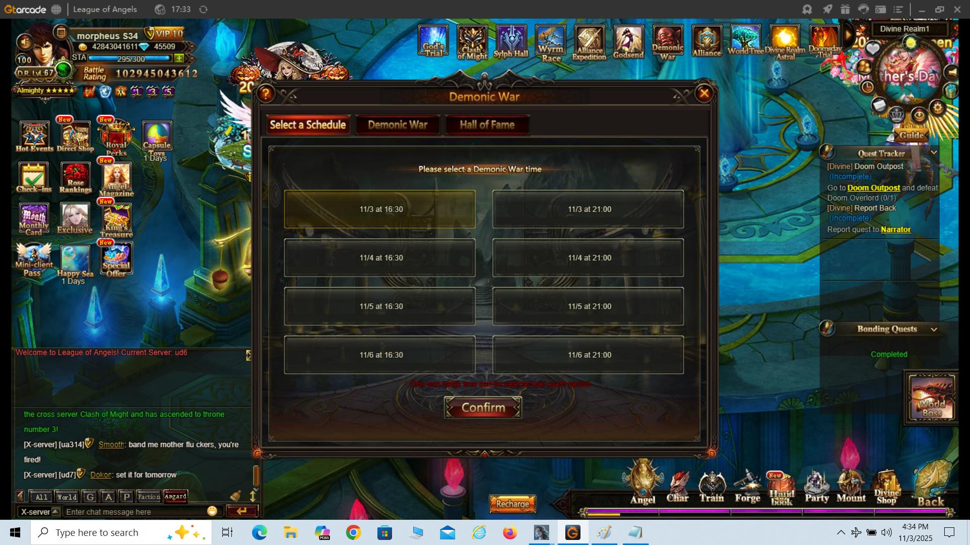 Demonic War auto set for 11/3 14:30 but would not run