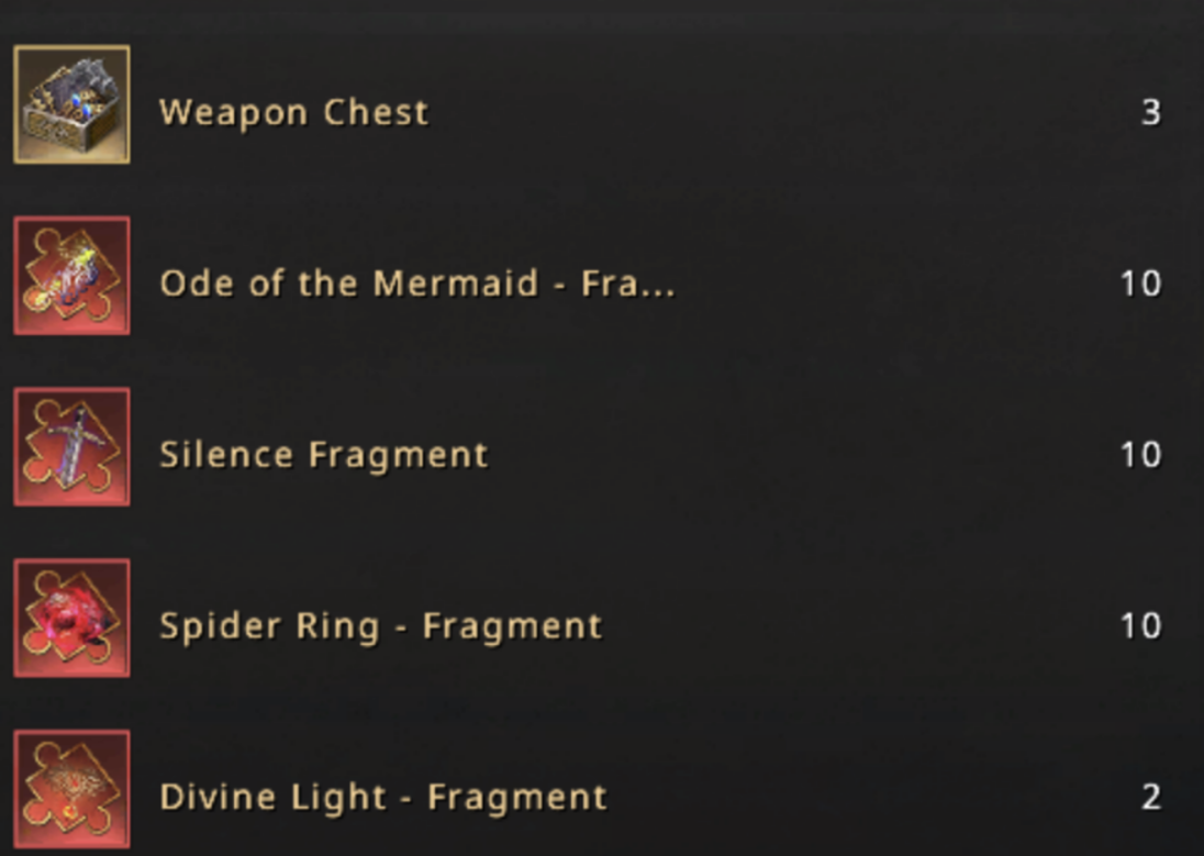 - Weapon Chest. The weapon chest which offers reforge stones, locking stones, and fragments of the weapons of Jeane, Russel, Varys and Melisandre.