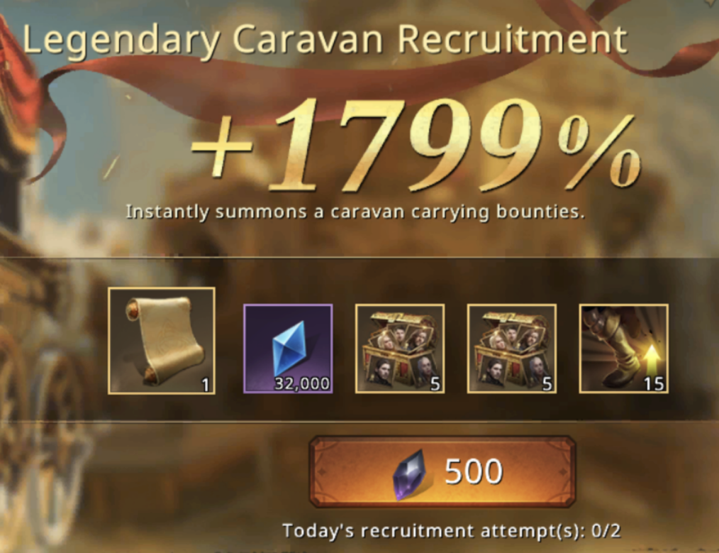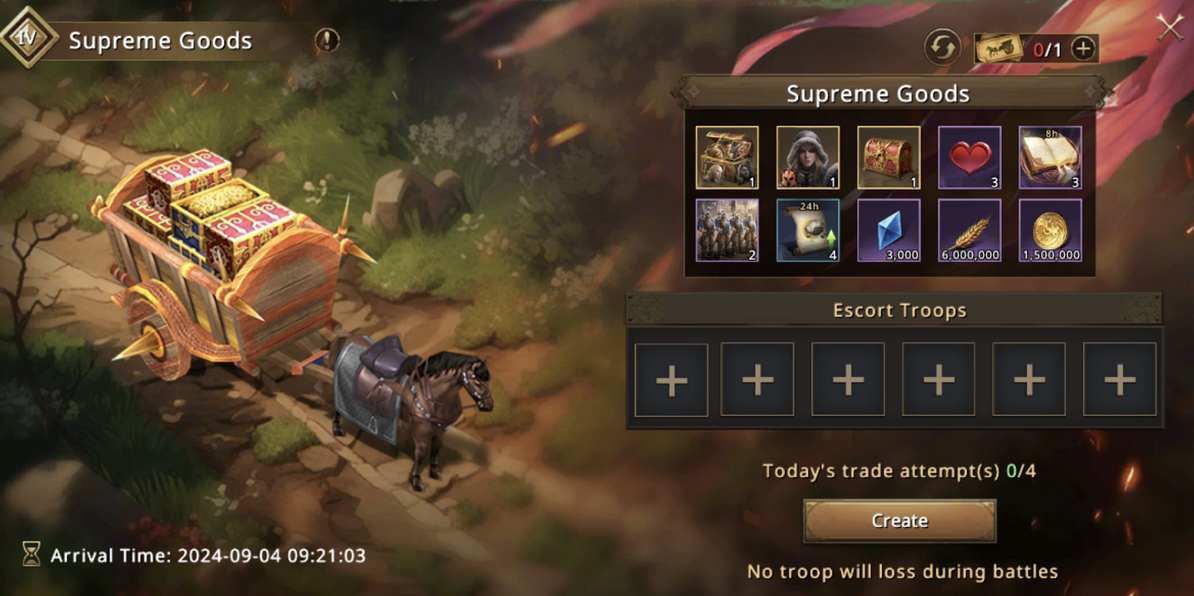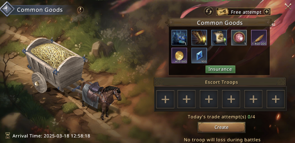 Apart from the four trade attempts and the four plunders, there is also the Caravan. Each alliance can spawn one Caravan, once every day. One player gets appointed guard and he needs to make three lines of defense with his commanders (similar to UT). There are four carriages and the rest of the alliance members, provided they have been in the alliance for over 24 hours, can register. Four players win, so they get the rewards for the specific carriage they registered for, while the guard receives all the rewards from all four carriages. There is no option however to insure the caravan rewards, so if they get plundered they remain lost.