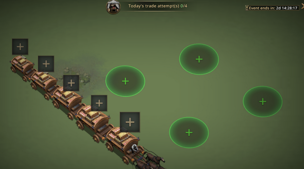 The Day of Trade appears every two weeks (alternating with Bounty Operation) and lasts for three days (Tuesday, Wednesday, and Thursday), which is the event phase. A fourth day, Friday, is allocated for display purposes and is called the settlement phase. The kingdoms are matched, based on their strength, in pools of eight kingdoms together, which are different every time. Every day, the players have four carriages available to them, known as trade attempts, and they can also plunder other carriages four times. You can plunder carts that belong to players in different alliances in your kingdom or from the seven other kingdoms that are pooled together with your own.