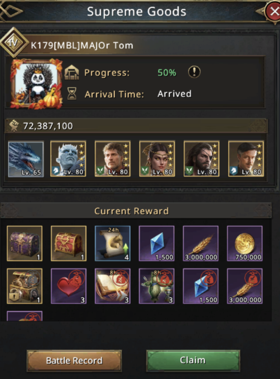 Once the carriages are rerolled to the player's liking, the player can set out. You can choose 5 commanders to accompany the carriage and the game will provide up to two million troops from the higher tier that the player has unlocked. Since the carriages can be plundered, it is suggested to set out with your lord march and in battle gear, refinement and talents. The stats are live so if the player changes lord to kill rebels, the carriage will become a lordless march. Also since you can use the commanders only in one carriage at a time, theoretically you should send them off one by one.