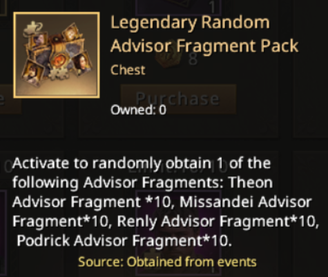 - Legendary Random Advisor Fragment Pack - gives 10 fragments of one of the same Legendary Advisors at random.