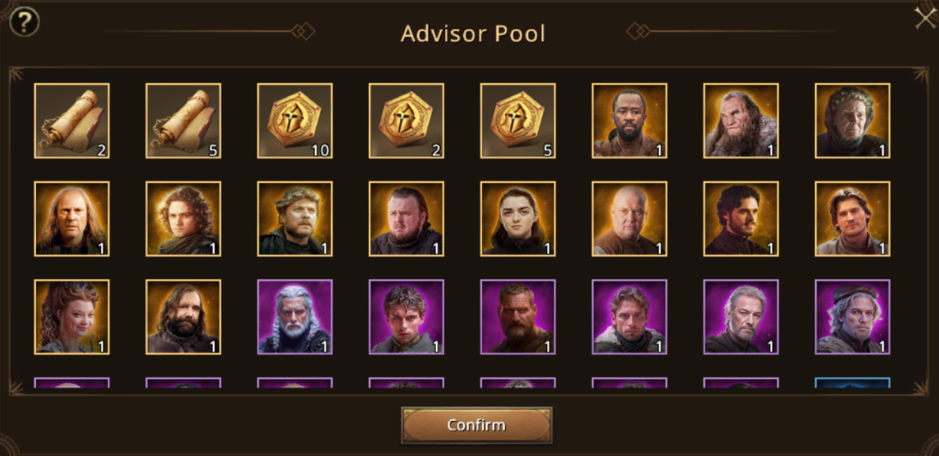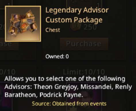 - Legendary Advisor Custom Package - lets you pick one of the featured high-tier Advisors such as Theon Greyjoy, Missandei, Renly Baratheon, or Podrick Payne.