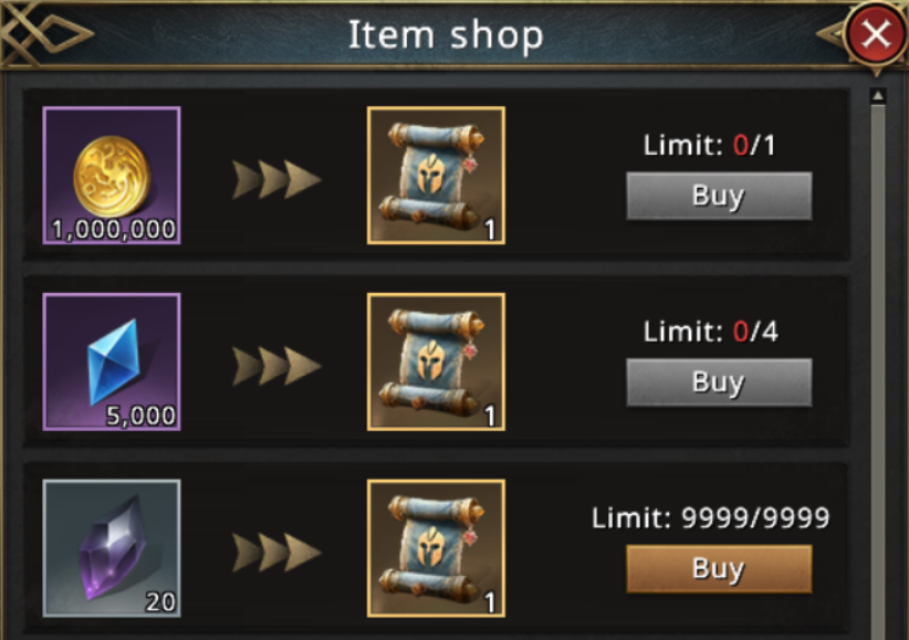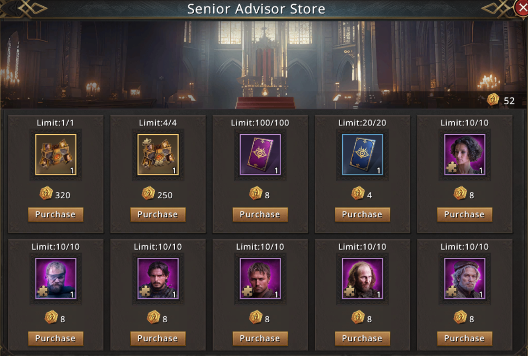 - Selected Epic-tier Advisor fragments - can be bought directly, each with its own purchase limit.