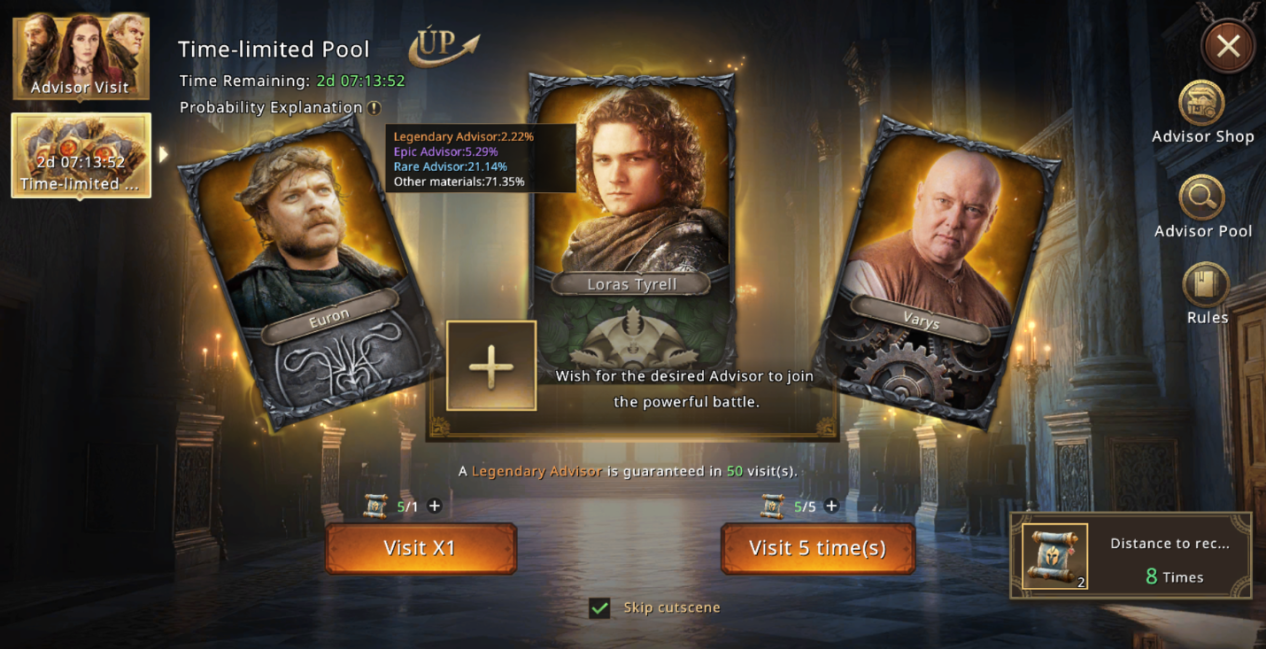 The pool also has a pity counter: after 50 draws, you are guaranteed to receive a Legendary Advisor. This counter resets each time you hit the pity reward.